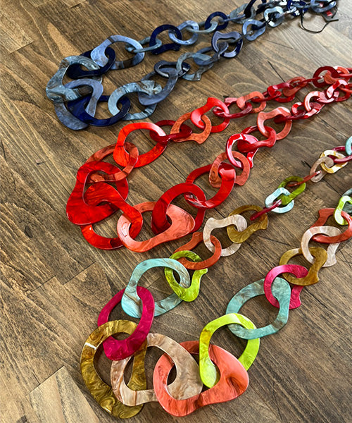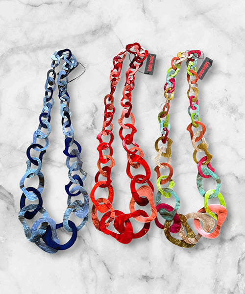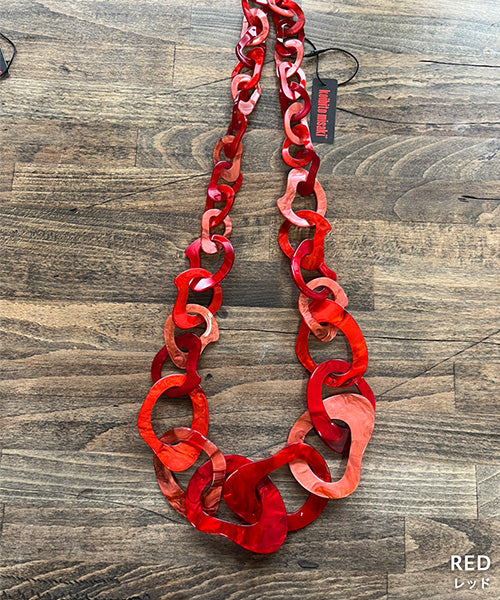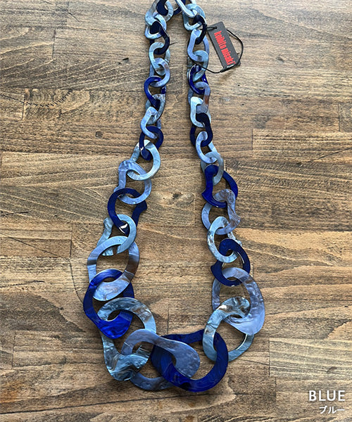 ニュアンスのあるマーブルカラーが印象的な、存在感たっぷりのリンクネックレス。 大小のチェーンパーツを組み合わせた立体的なデザインが、コーディネートにモードなアクセントをプラスします。 軽量なアクリル素材を使用しているため、ボリューム感がありながらもストレスフリーな着け心地です。