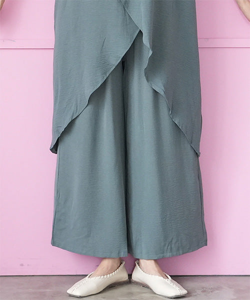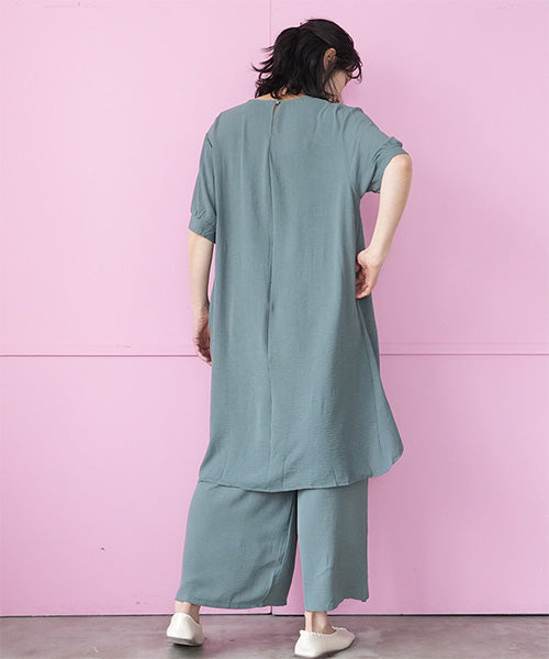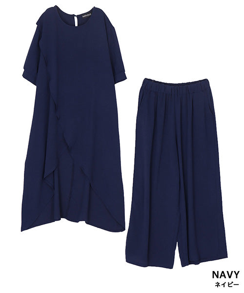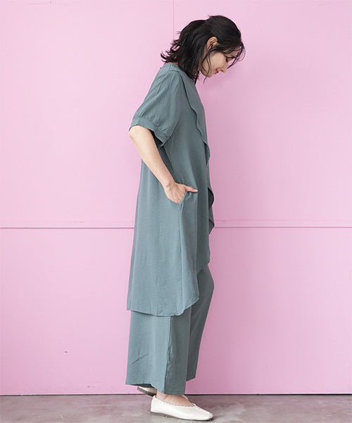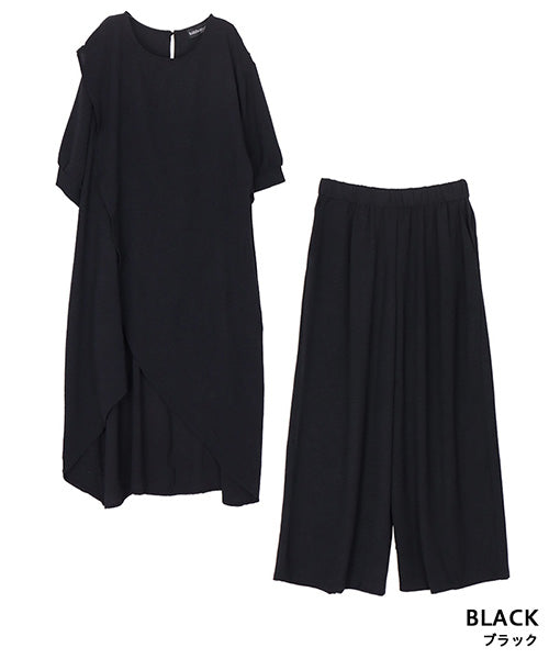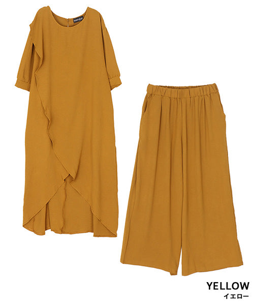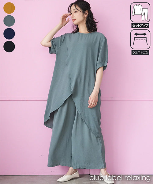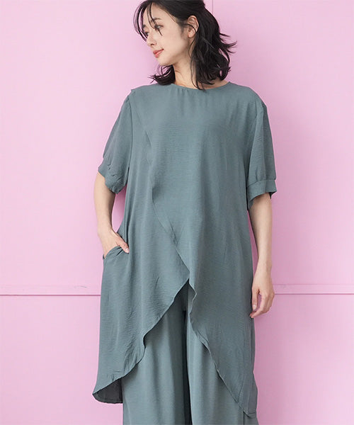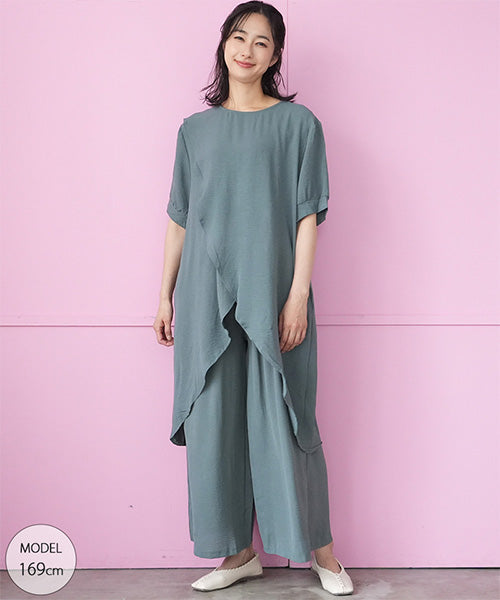 【商品説明】アシンメトリーなチュニック×ワイドパンツのセットアップ。 通気性の良い薄手生地を使用し、暑い季節も快適な着心地です。 後ろ裾が長いデザインでこなれ感をプラスし、スタイルアップが叶います。 チュニックとパンツは単体でも着まわせるので使い勝手抜群です。