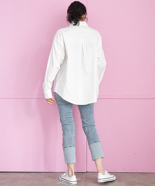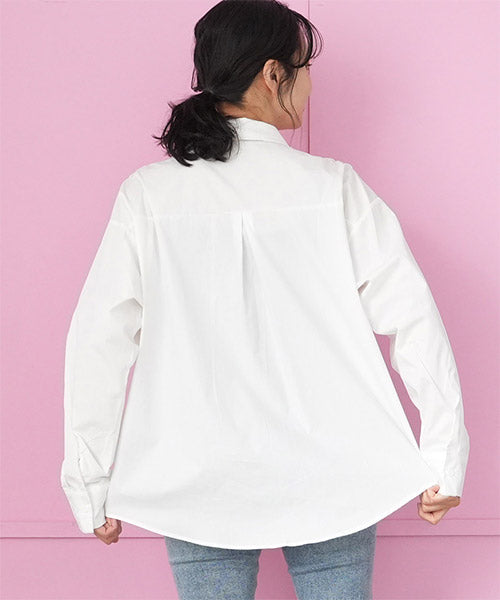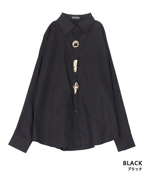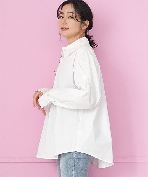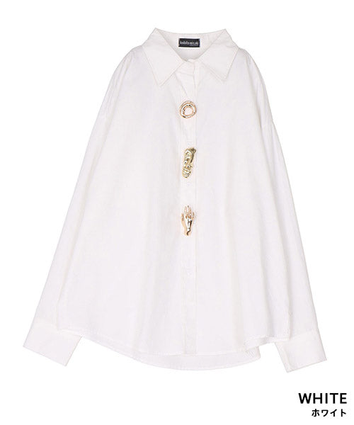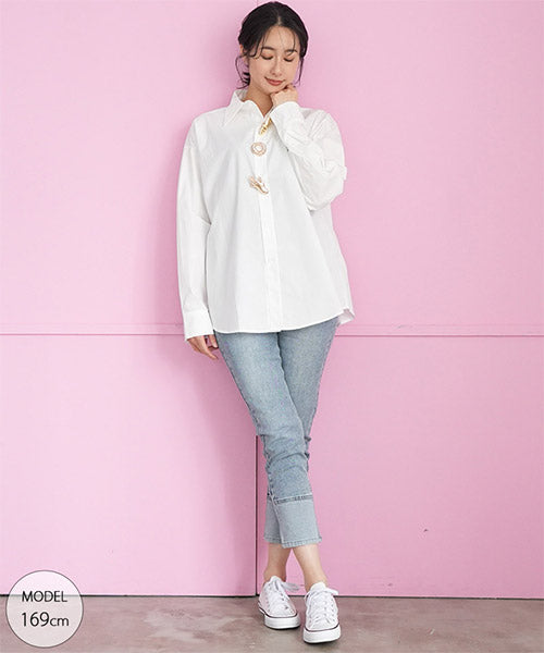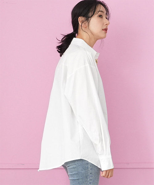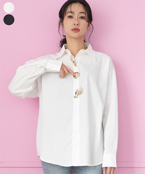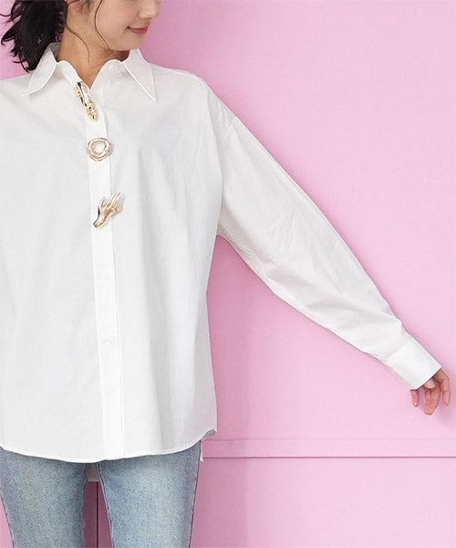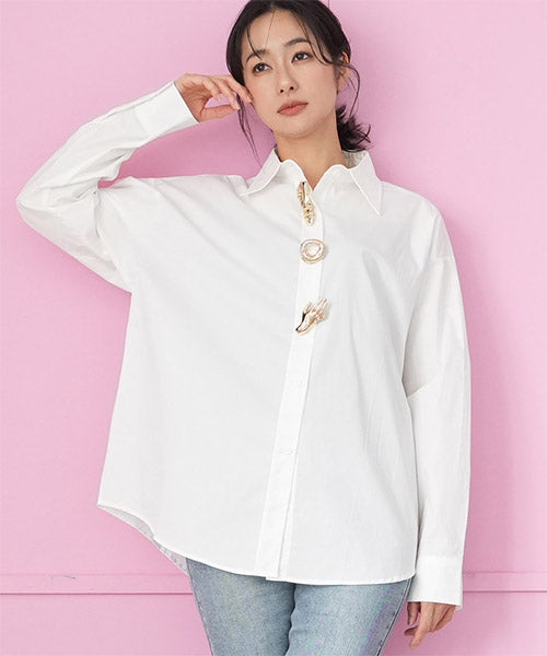 無地のスタンダードシャツブラウスにモードなブローチを付属に付けた、お得感いっぱいのアイテムです。 オーソドックスなシャツなので、自由にコーディネートが楽しめます。 オーバーサイズなので、リラクシーな着心地です。 付属のブローチは3種類あるので、お手持ちのアイテムにも幅広く対応できます。