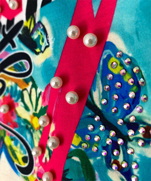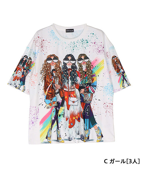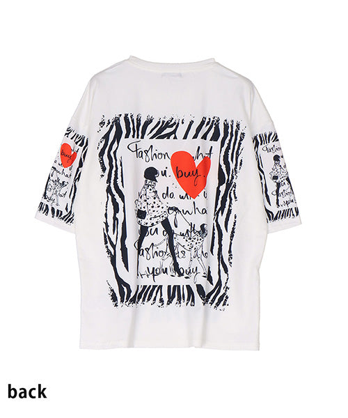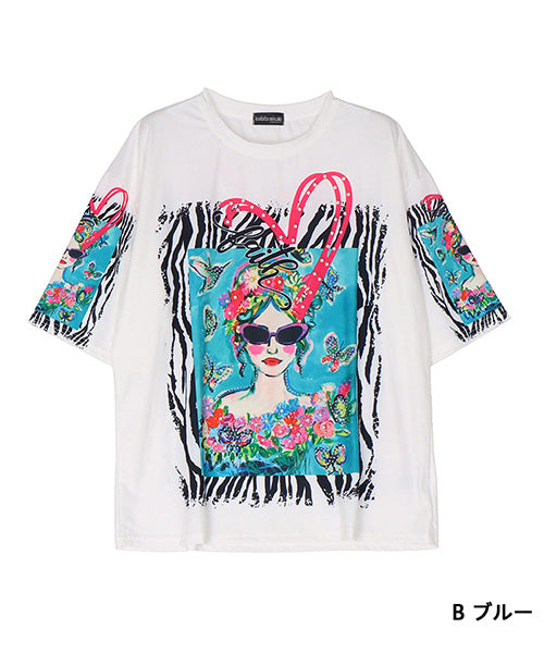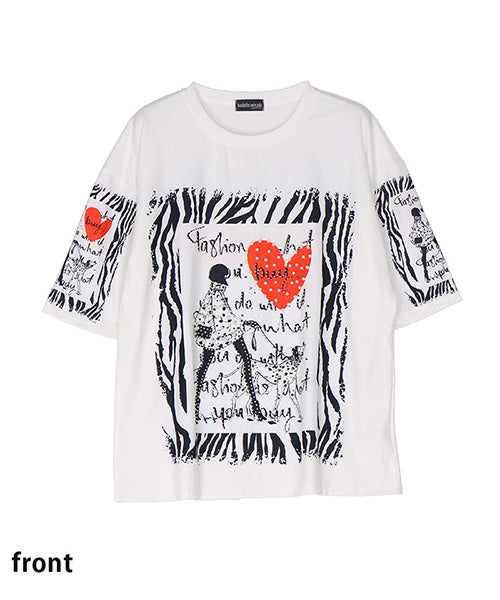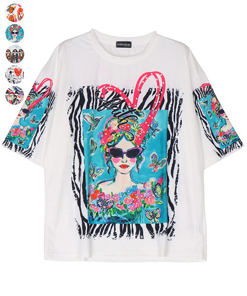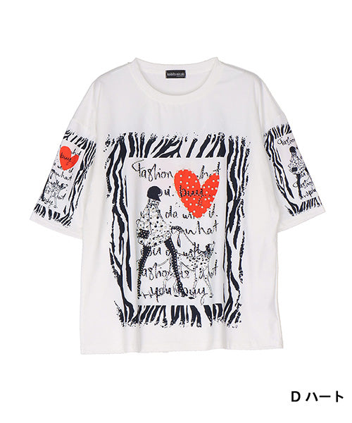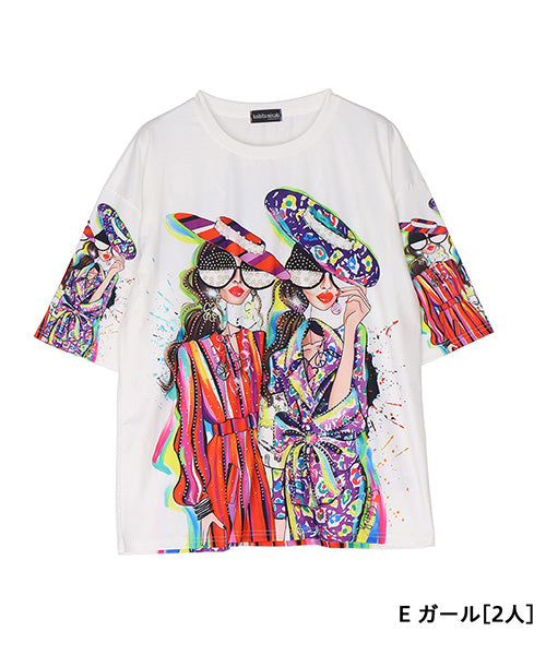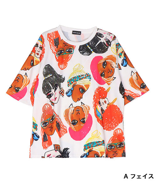 個性的なモード感溢れる柄が、所狭しとプリントされたTシャツです。 パンチの効いたプリントの上、更にビジューを施し類を見ないデザインになっています。 ゆったり幅で、デイリーファッションとしてリラクシーに着こなせます。