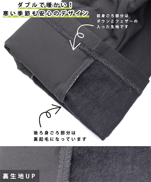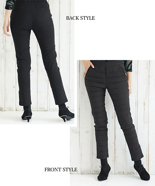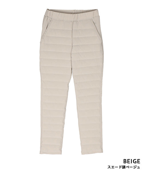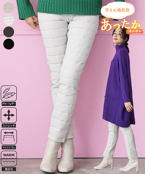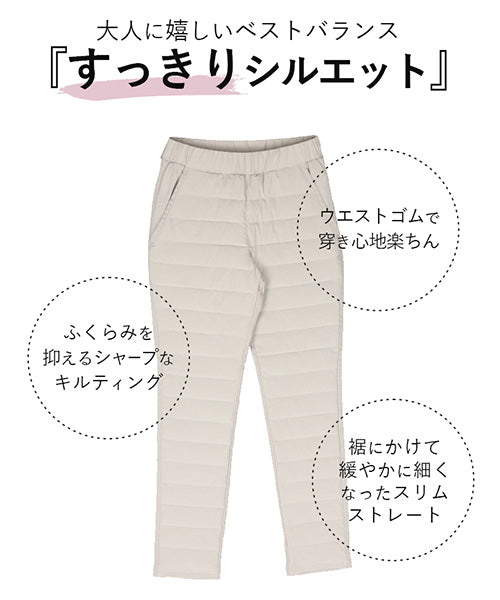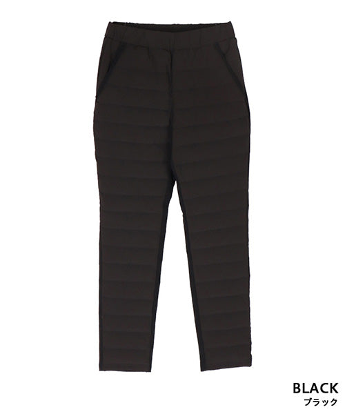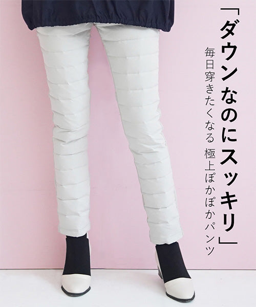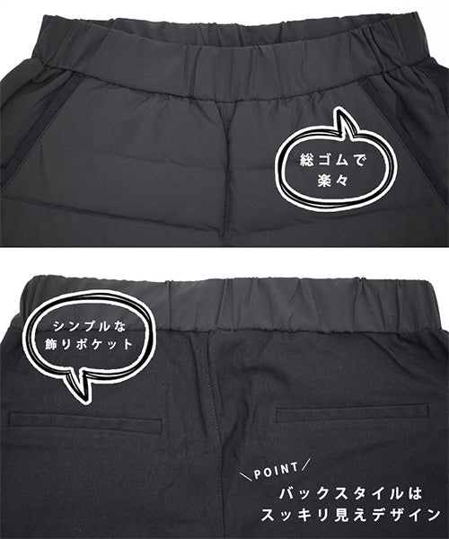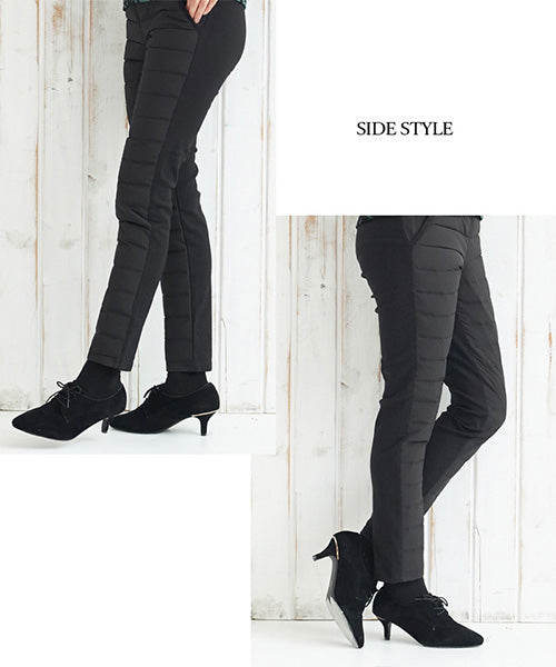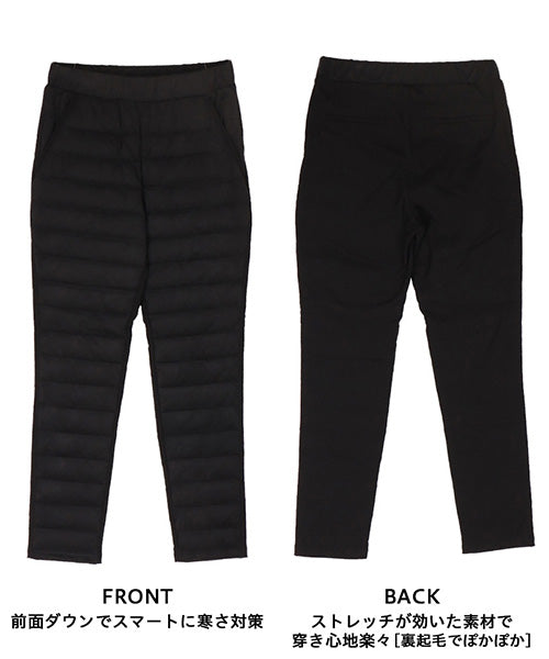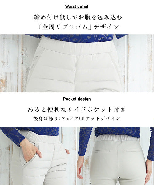 【デザイン】 暖かくて細く見える優れたパンツ、前身頃はダウン・後ろ身頃は裏起毛カットソーの異素材切替でウエスト総ゴムなので着脱もらくな仕様です。 【素材・着用感】 裏起毛で脚を通した瞬間から暖かく、ウエストゴムなのでお腹周りもストレスフリーです。着ぶくれせずにスッキリ見えるこだわりの切替で、動きやすさもしっかり実現します。