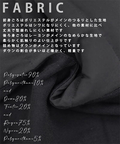 前身頃 ポリエステル90% ポリウレタン10%詰物 ダウン80% フェザー20% 後身頃 レーヨン75% ナイロン20% ポリウレン5%