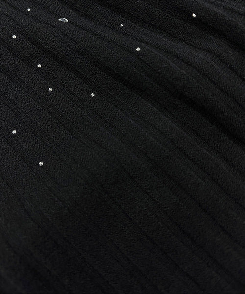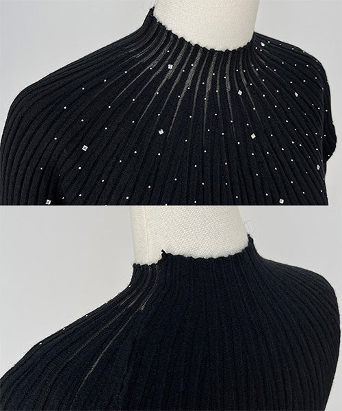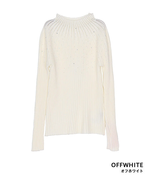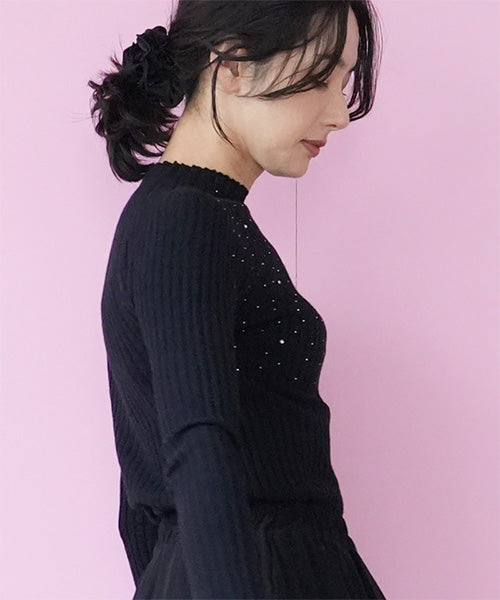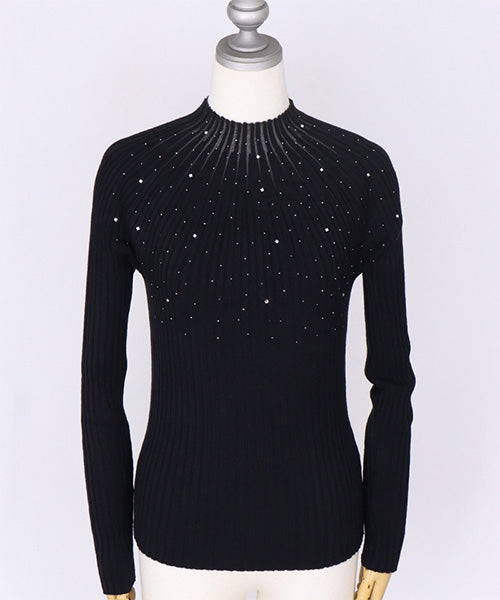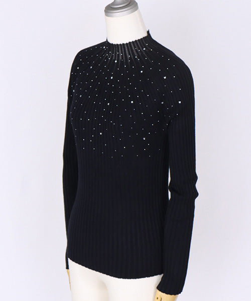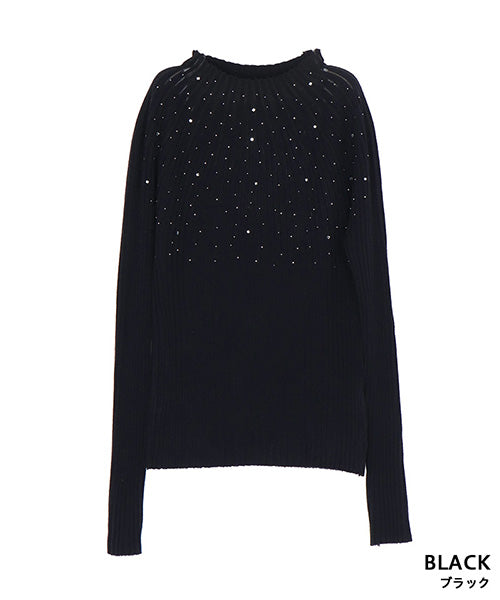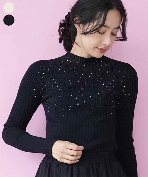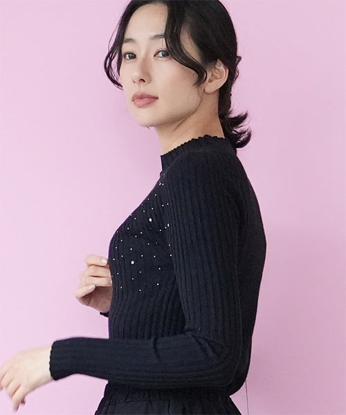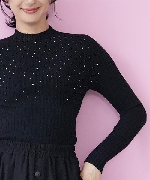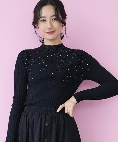 ラインストーンが顔まわりを華やかに映してくれるニットプルオーバー。