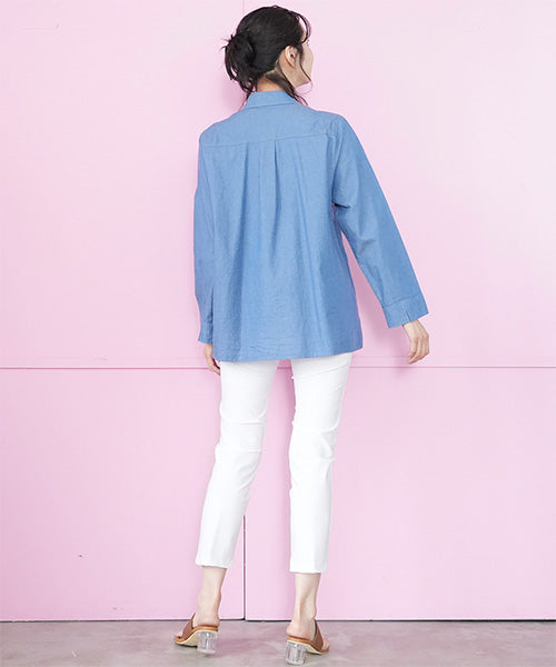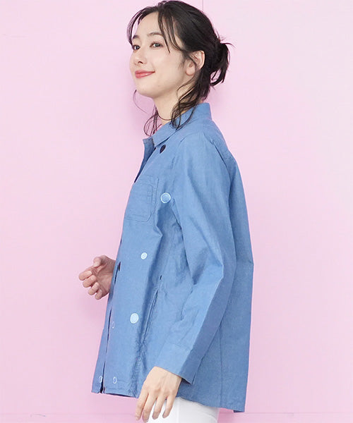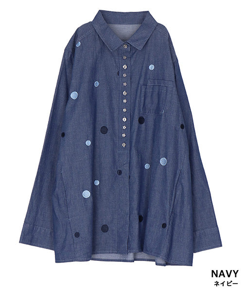 星型飾りボタンとドット刺繍が愛らしい、シャツブラウスです。 前立ての裾は比翼仕立てになっているので、被りブラウスのようなデザインです。 左胸のWパッチポケットが、一層可愛らい印象にしています。 袖口にもスリットが入っており、細部までこだわりました。