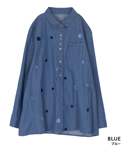 綿100%ラウンド刺繍飾りボタン付きシャツブラウス 55-0093