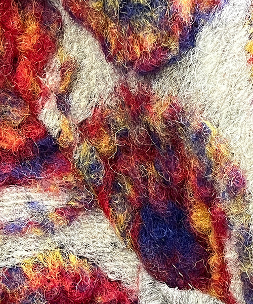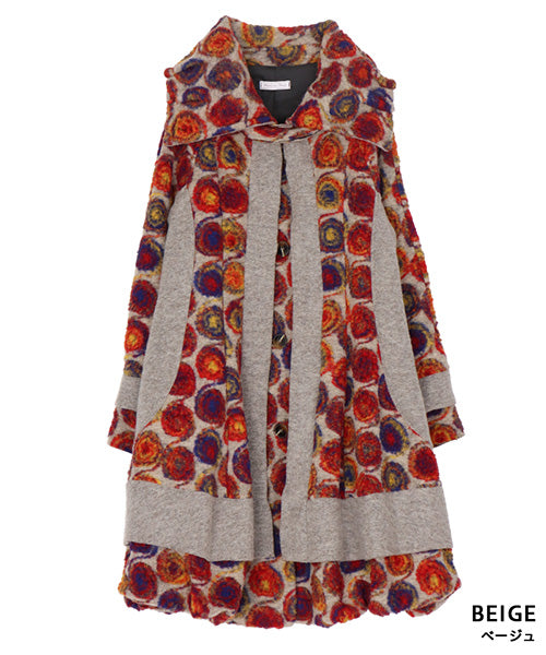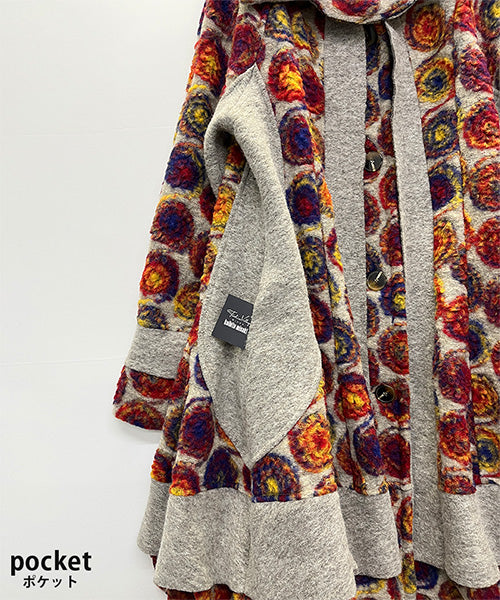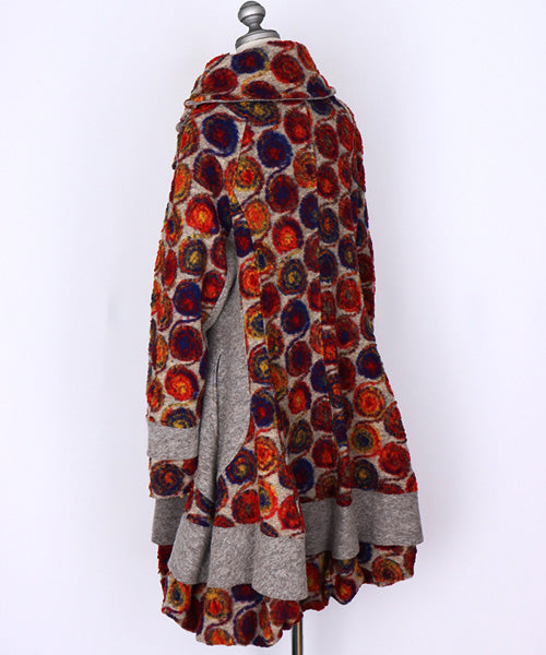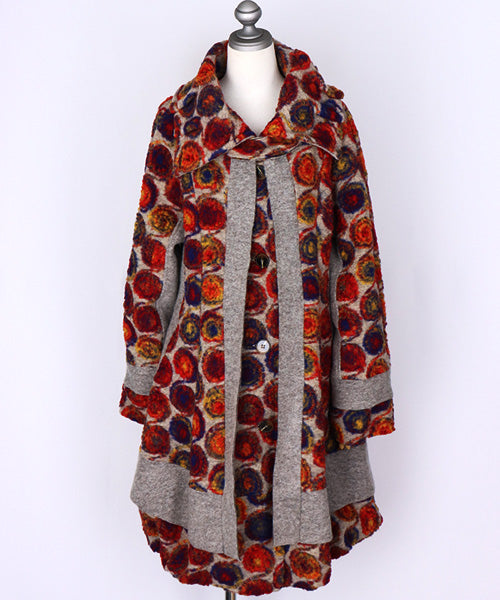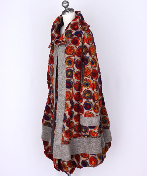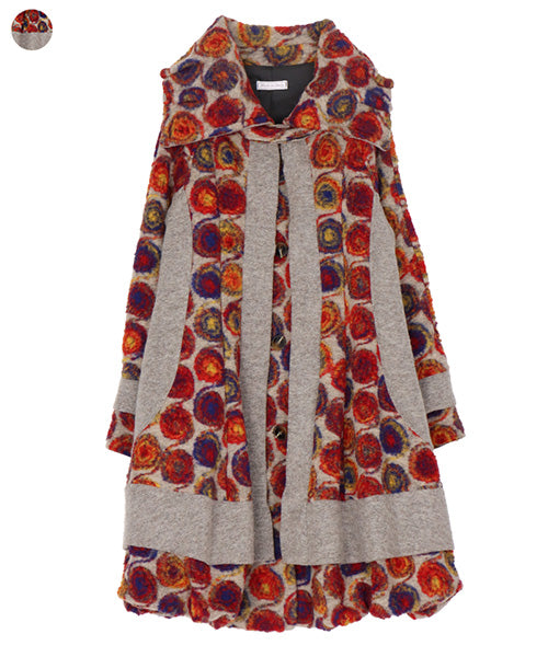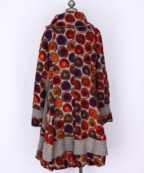 鮮やかなレッドやオレンジ、ブルーのアートサークル柄が目を惹く、イタリア製のコート。