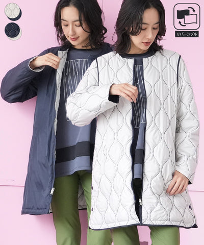 リバーシブル星柄ステッチキルトノーカラー中綿コート 33-0452