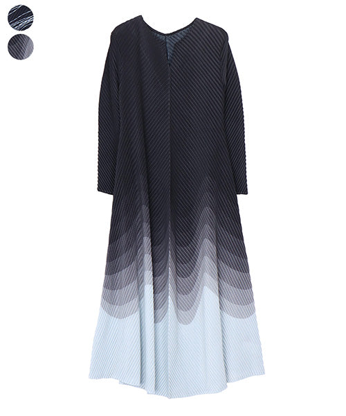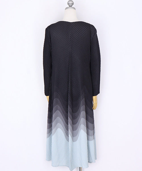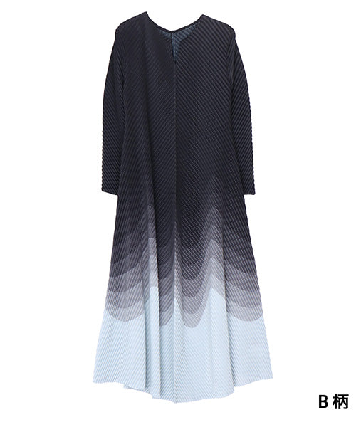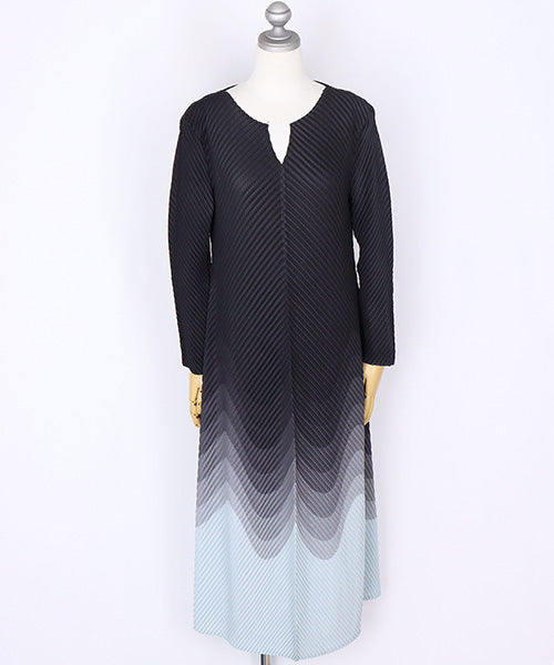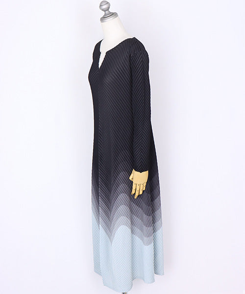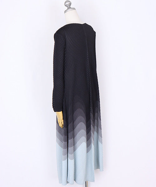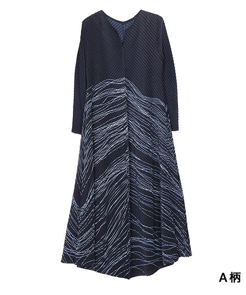 軽やかなプリーツ素材にアートのようなプリントを施した、存在感たっぷりのワンピース。 上半身は細かなプリーツでシャープに、裾に向かって広がるシルエットが女性らしい美しいラインを演出します。 伸縮性のあるプリーツ素材で着心地も快適。シワになりにくく旅行やお出かけにもぴったり。1枚でスタイルが決まる主役級ワンピースです。