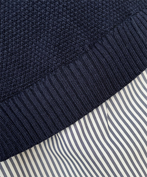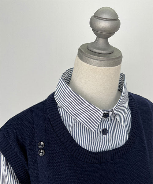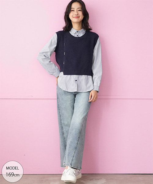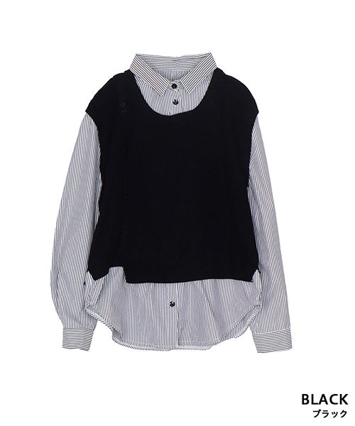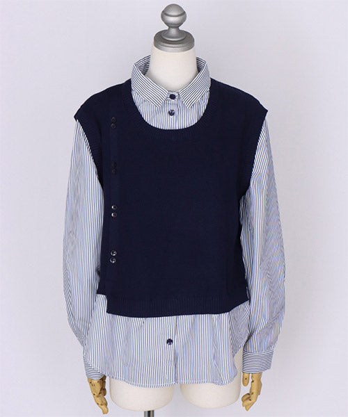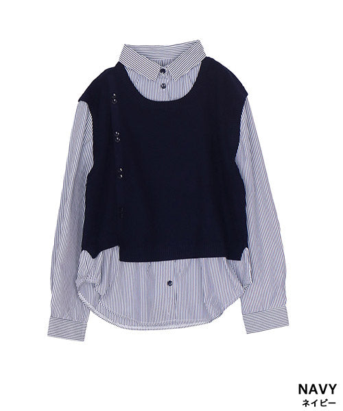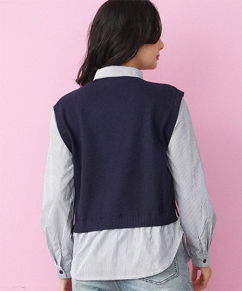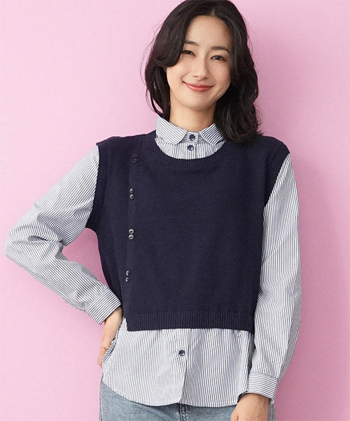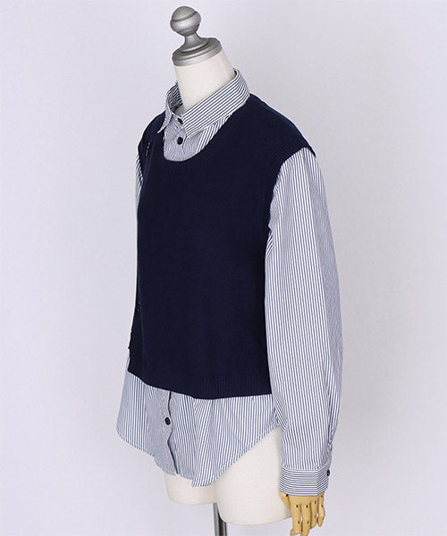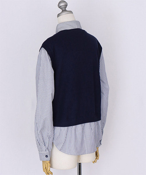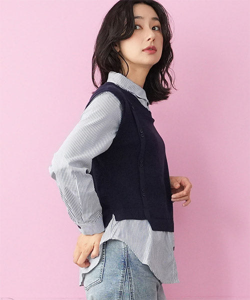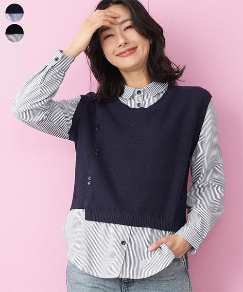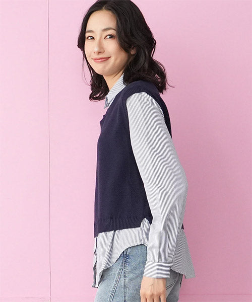 1枚でこなれ感を演出できる、ニットベストとストライプシャツがドッキングされたレイヤード風トップス。