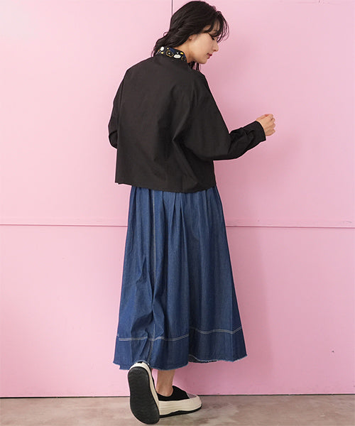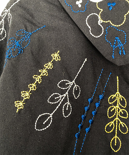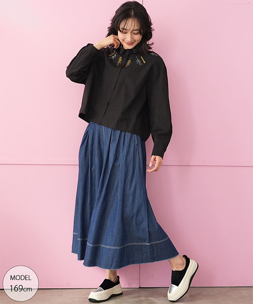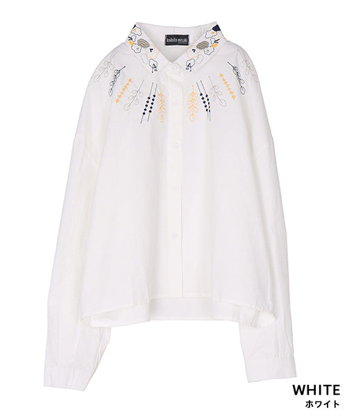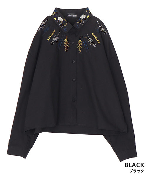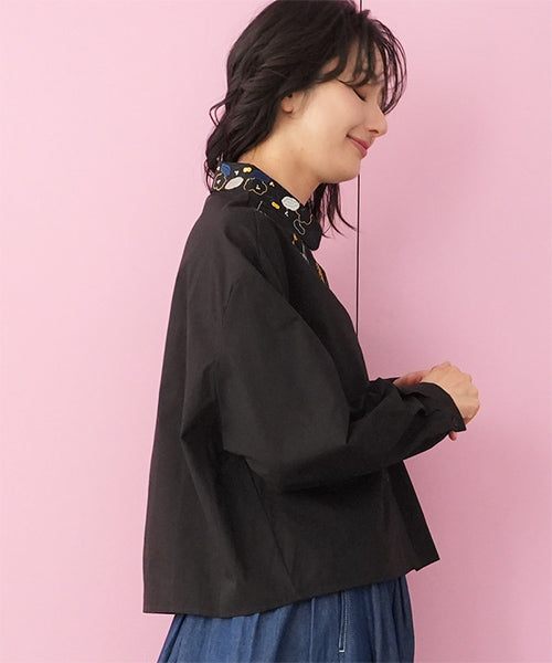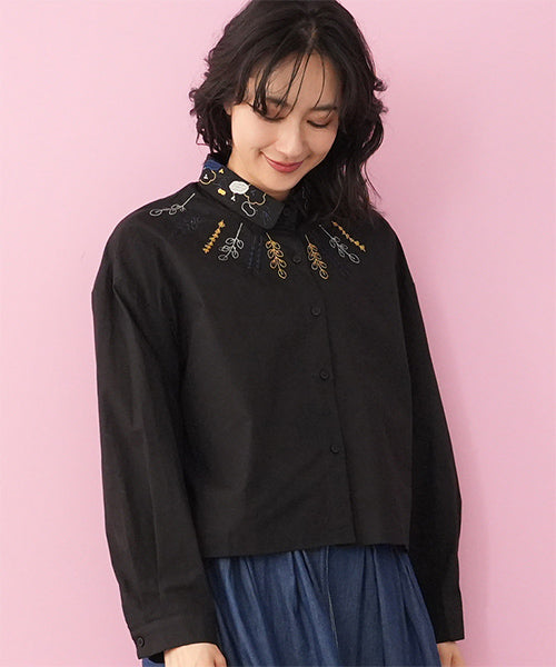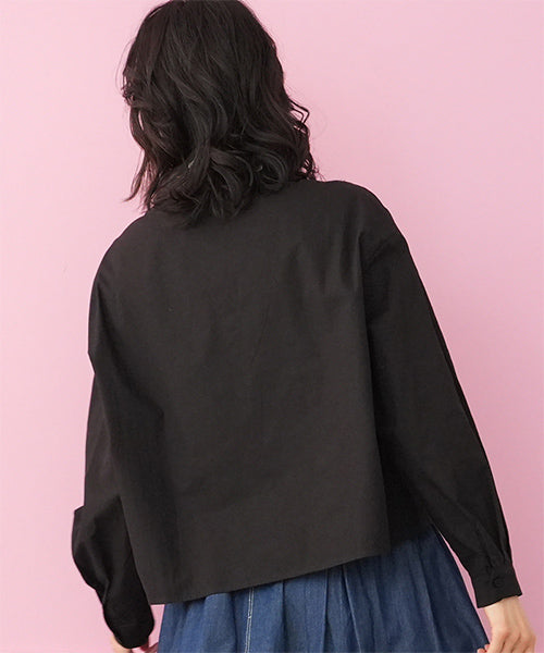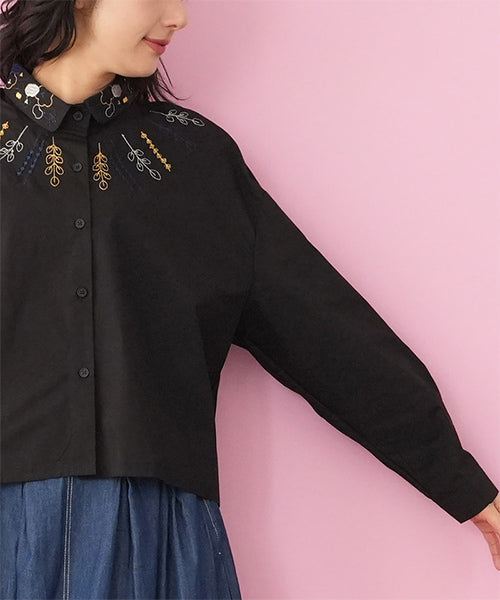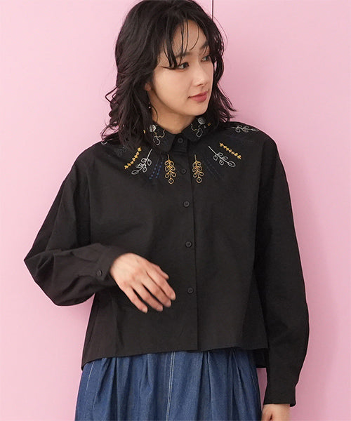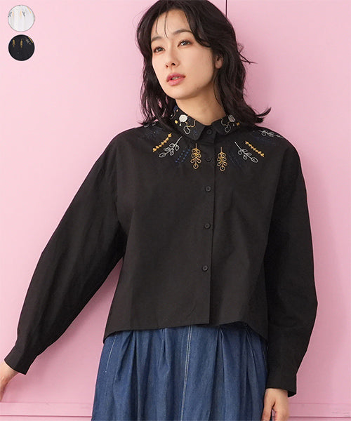 小さめラウンドカラーに可愛らしいステッチ刺繍がちりばめられています。 前身頃にはヨークのように葉柄刺繍が施されており、お顔回りが可憐な華やかさになっています。 オーバーサイズなので着やすく、快適に過ごせます。 ショート丈は、さまざまなボトムに合わせやすくデイリーファッションに欠かせません。