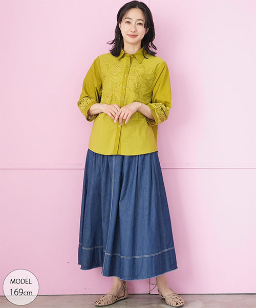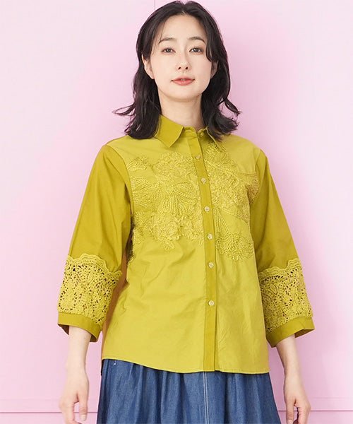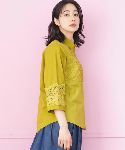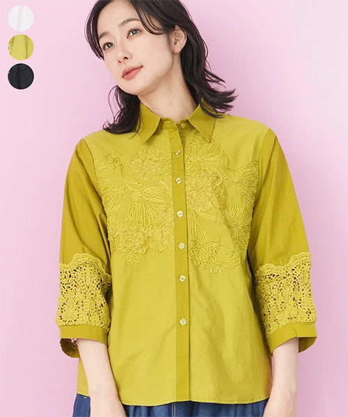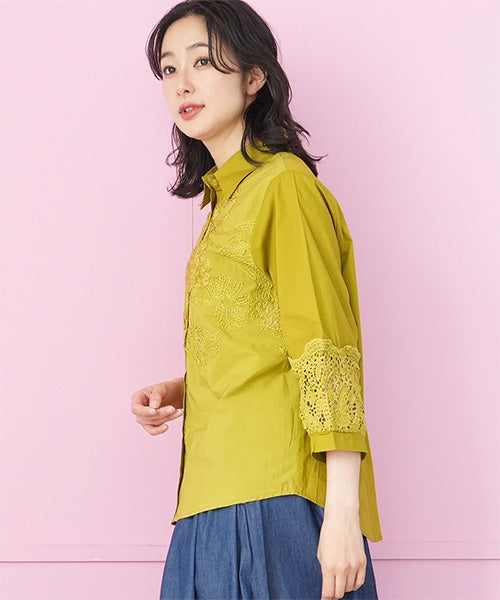 華やかなレース刺繍が落ち着いた高級感を漂わせる、綿素材のブラウスです。 袖のレース刺繍が、大人に似合う甘さ控えめの可憐さです。 一枚で完璧にオシャレが決まる理想的な一着です。 ルーズ過ぎないクラフト感溢れるフォルムに、スタイルアップ効果も期待できます。
