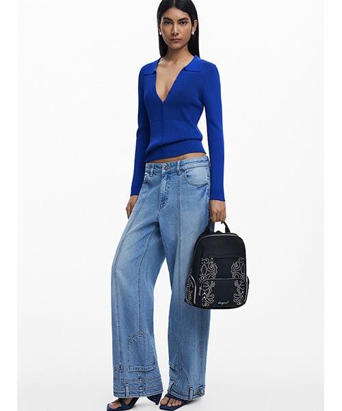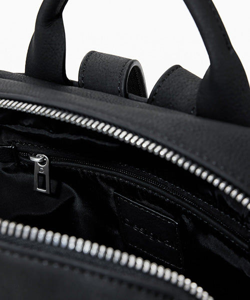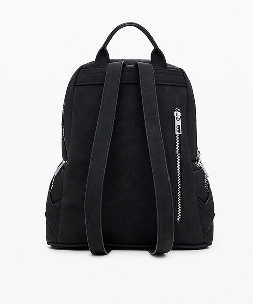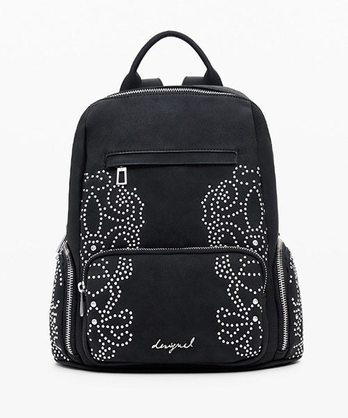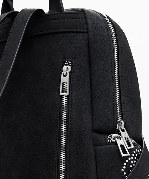 複数の外ポケットと金属スタッズの装飾が施された、小さなレザー風バックパック。