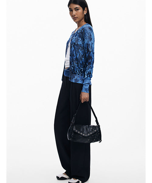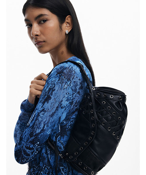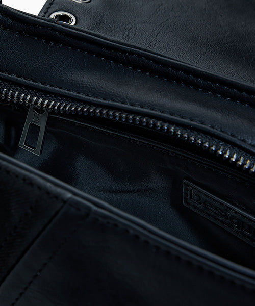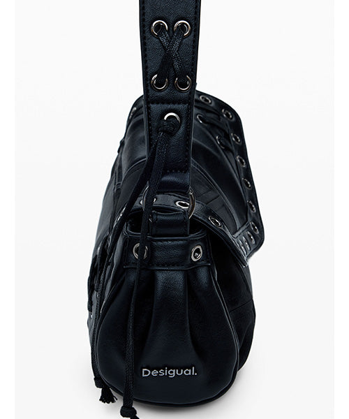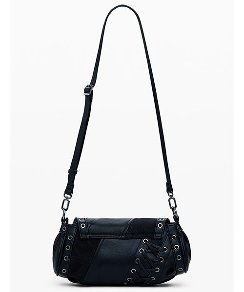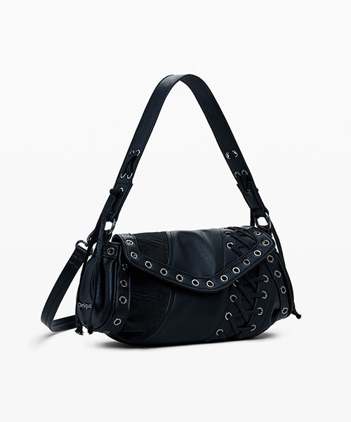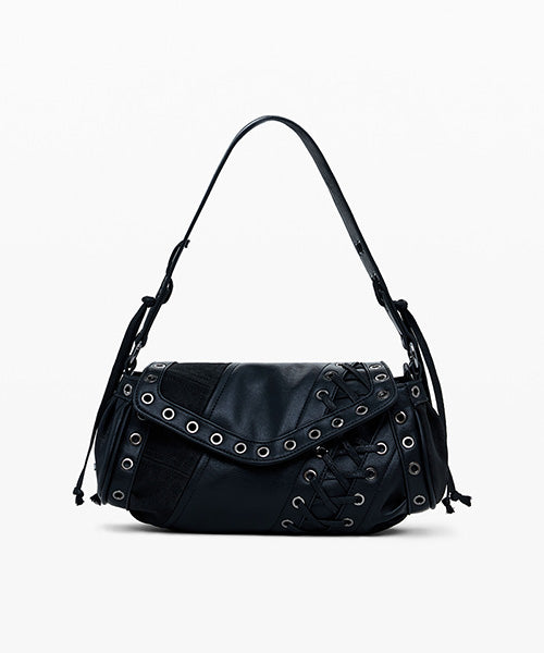 異なる生地のパッチワークスタイルで、中型サイズのショルダーバッグ。 レザー風の質感、装飾的な編み込みのディテールがお洒落です。