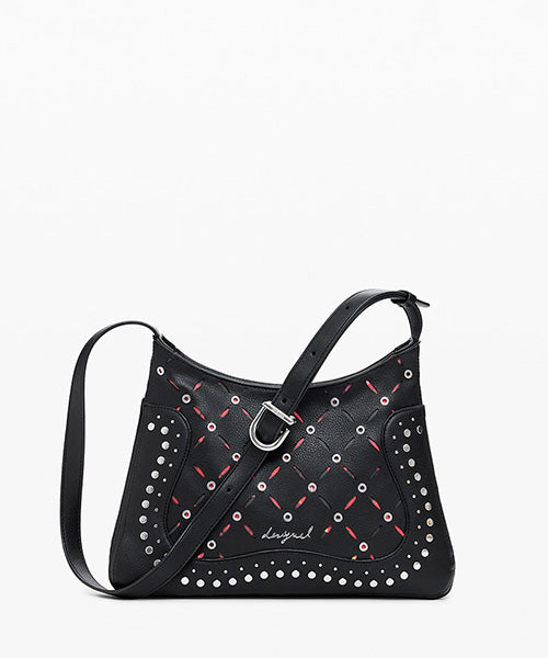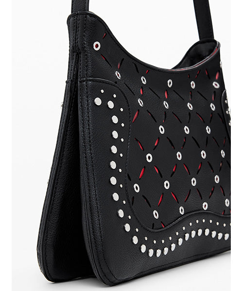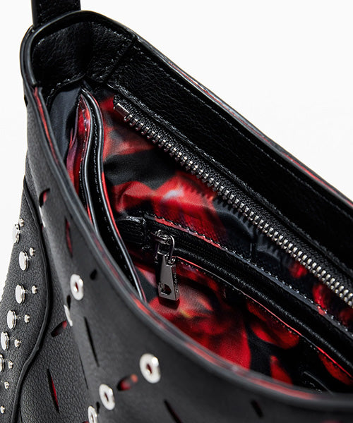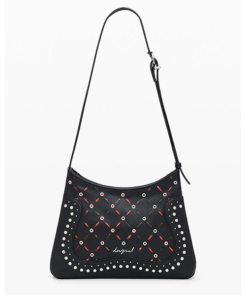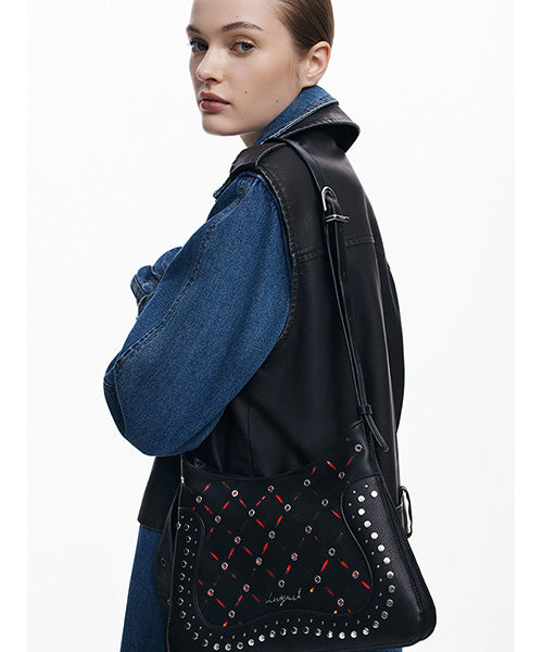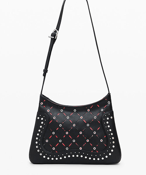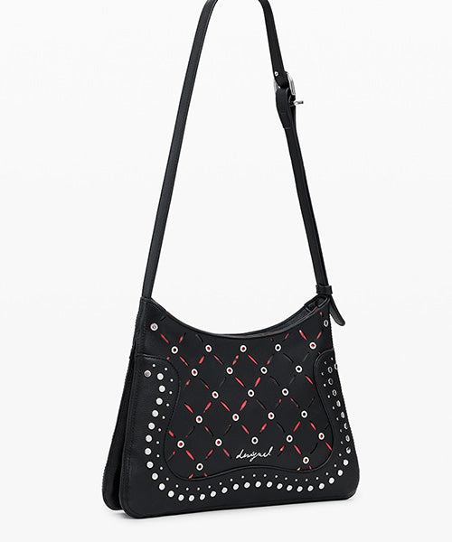 レザー風の生地にパンチングを施したの小さなサイズのショルダーバッグ。