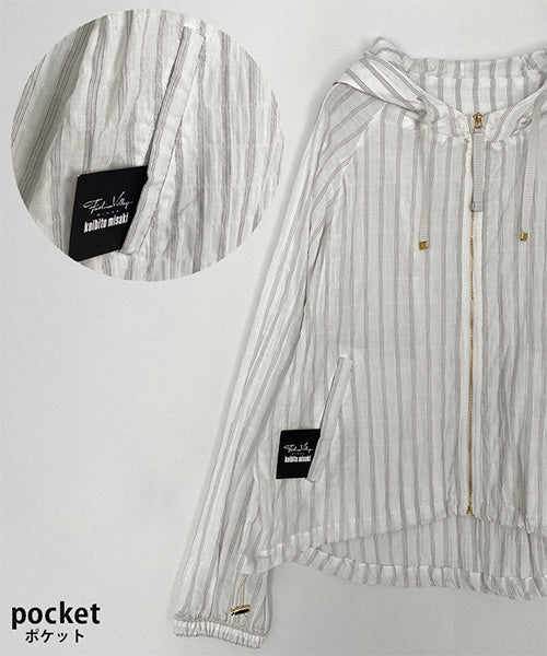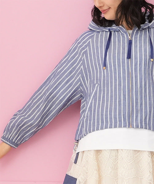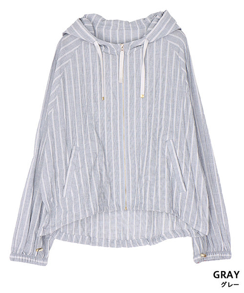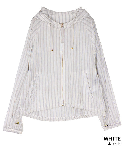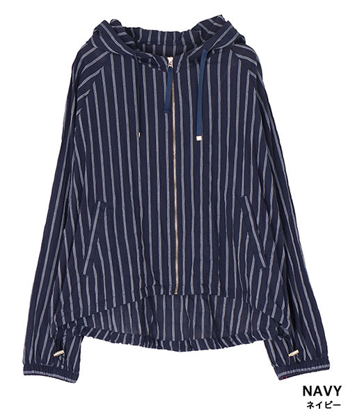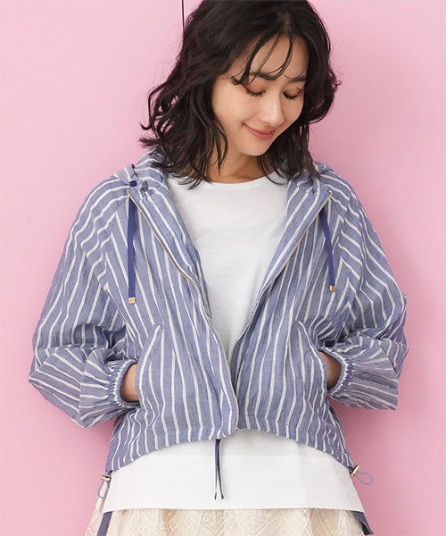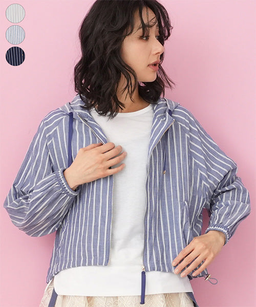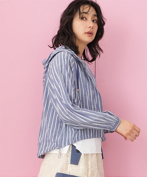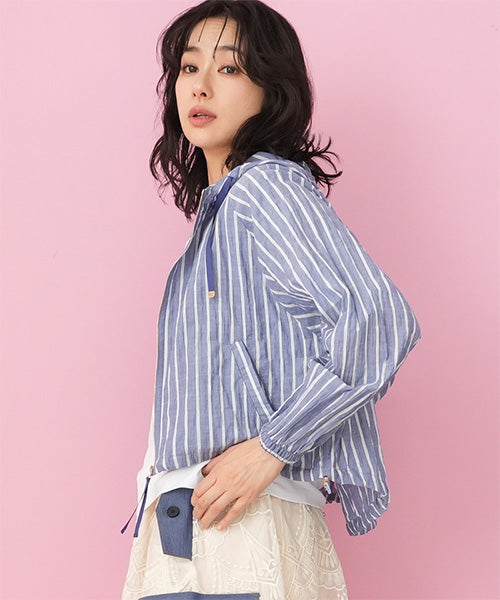 涼しげなストライプ柄で羽のように軽く、ラフな綺麗さが手に入るフード付きジャケットです。 ヒップ中心辺りの丈は、足が長く見えるのでスタイルアップが叶います。 スッキリ清潔感の漂う羽織りものは、テクいらずでお洒落な雰囲気を表現できます。 顔まわりを華奢に見せてくれるフードデザインで、首元の表情のキレイ見せを実現してくれます。