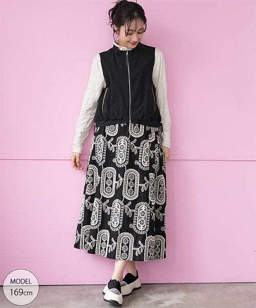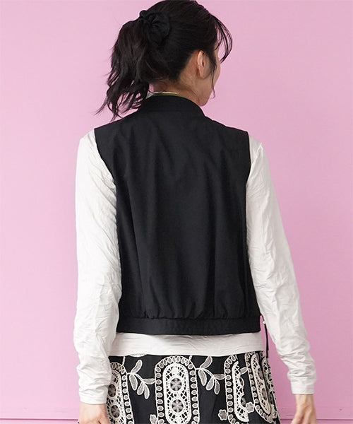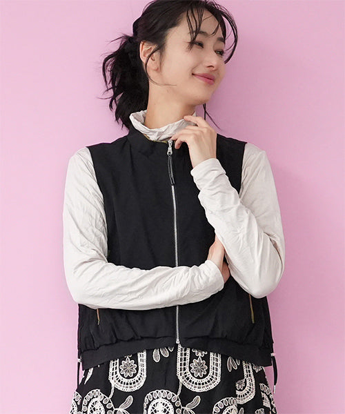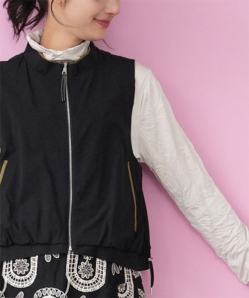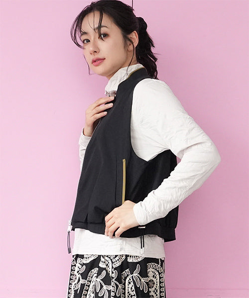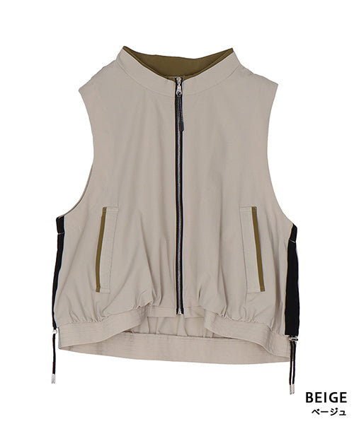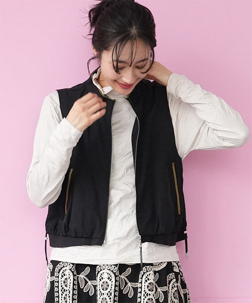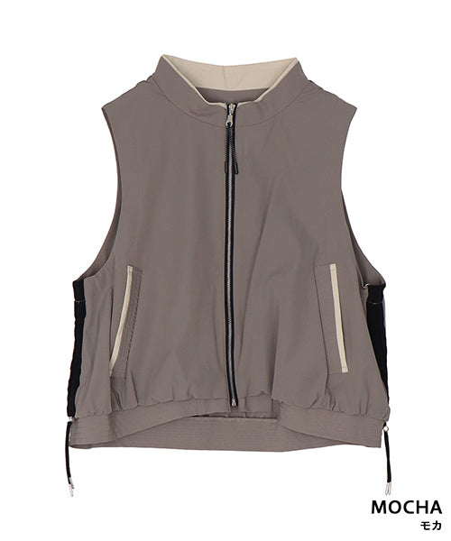 シンプルな中にさりげない配色デザインを効かせた、ジップアップ仕様のショートベスト。