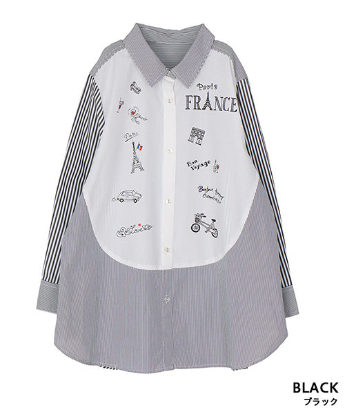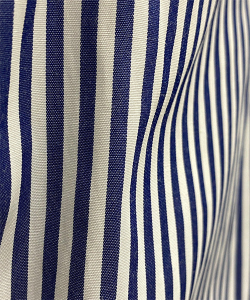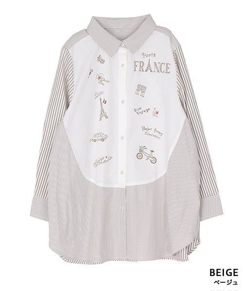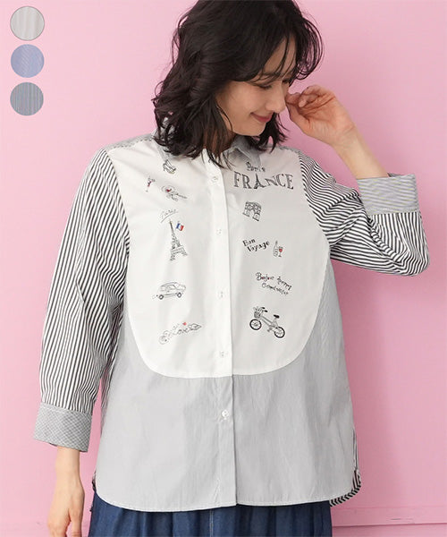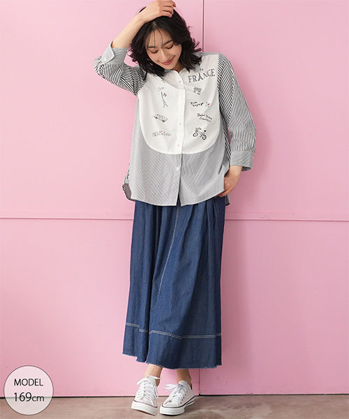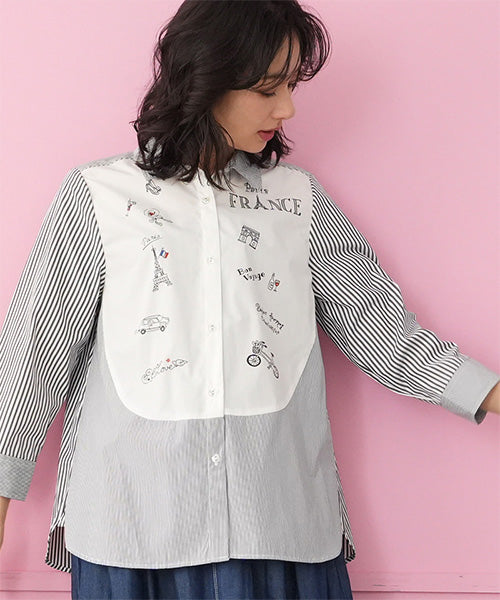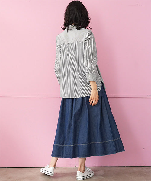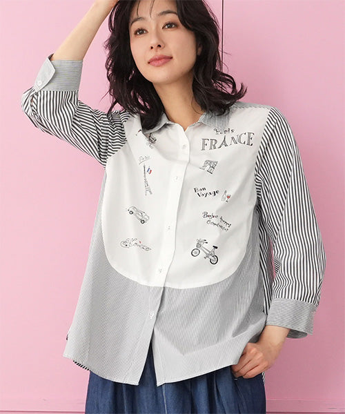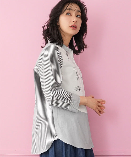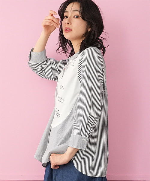 太さの違うストライプを巧みに切り替え、お洒落センスを醸し出すキレイめカジュアルのシャツブラウスです。