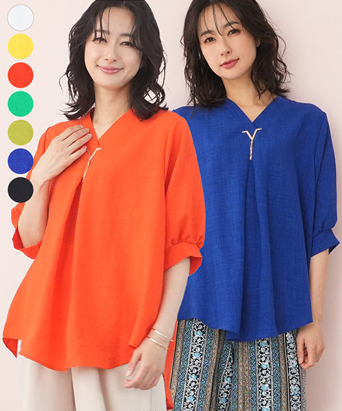 胸元のメタルパーツと背中のボタンが特徴のブラウスです。