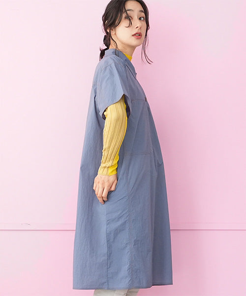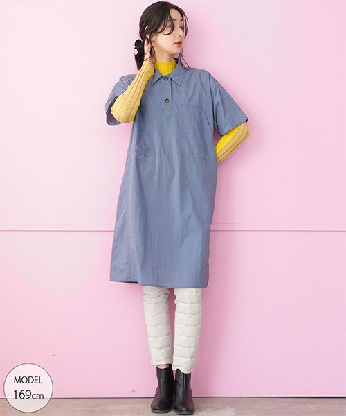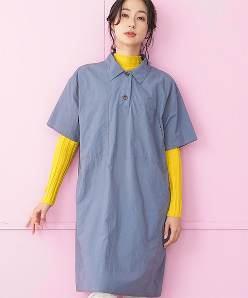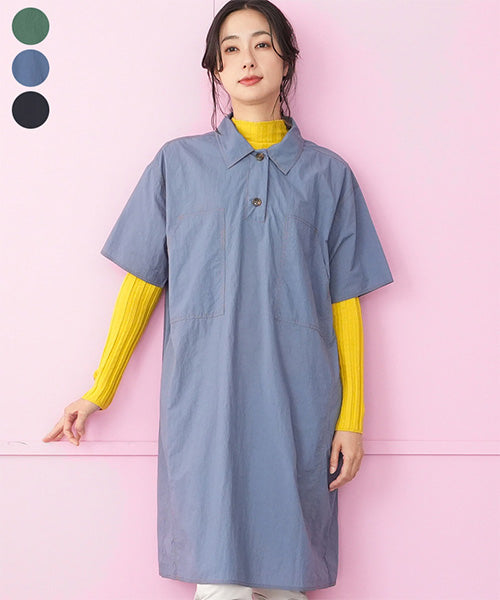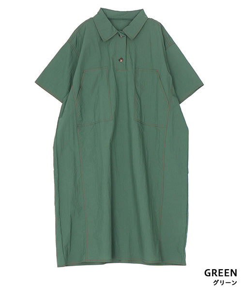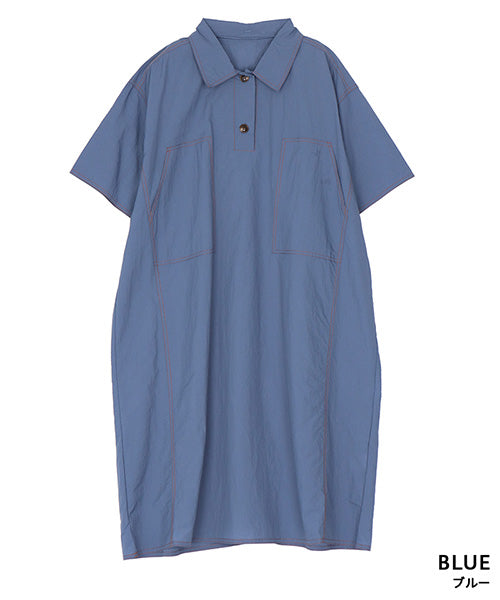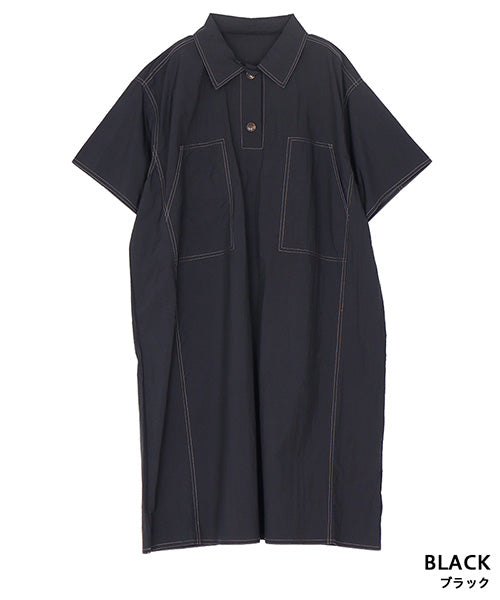 ナイロン100%ステッチアクセント襟付きAライン半袖ワンピース 36-1765