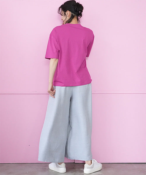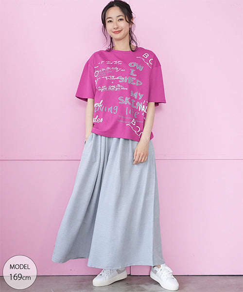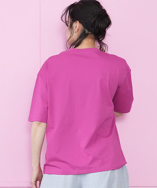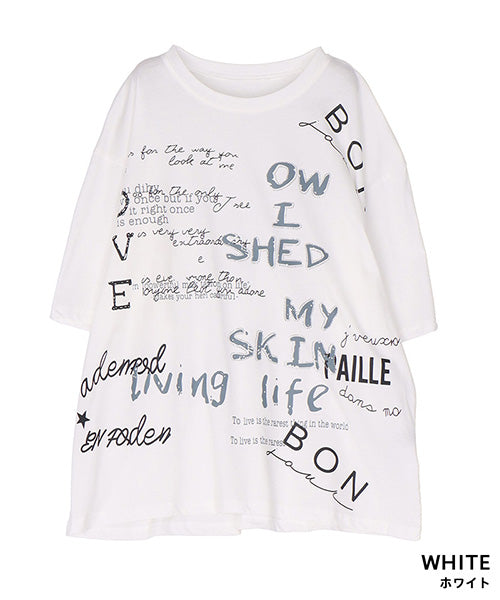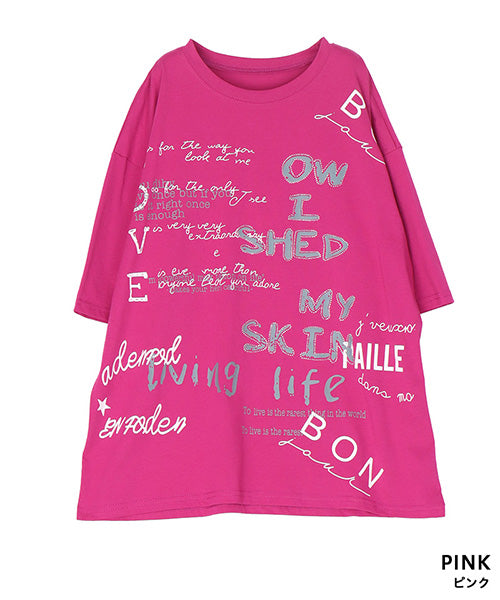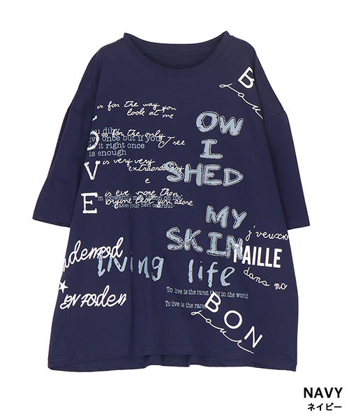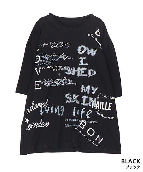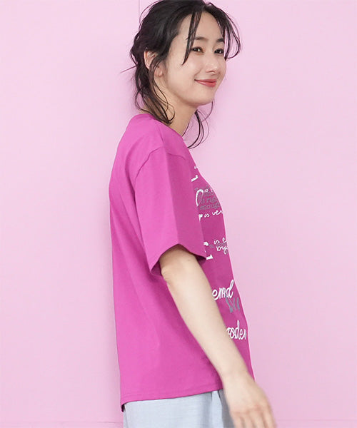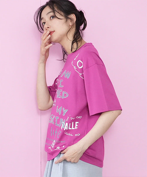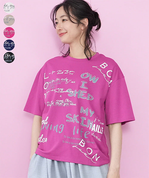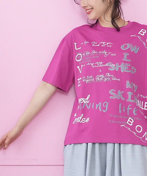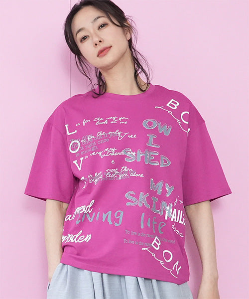 英字プリントとビジューがフロントいっぱいに広がった、カラフルなカットソーです。