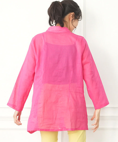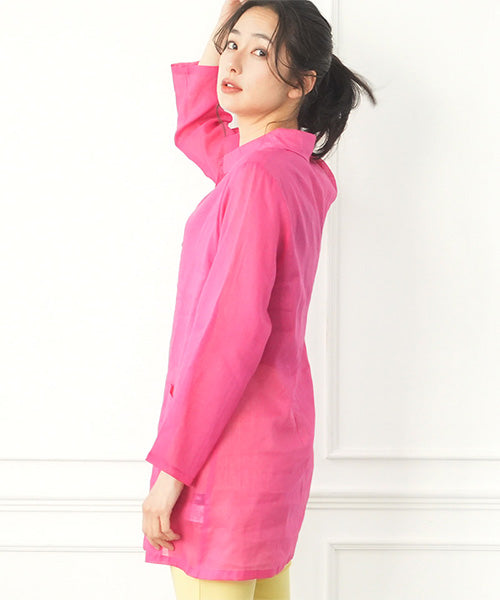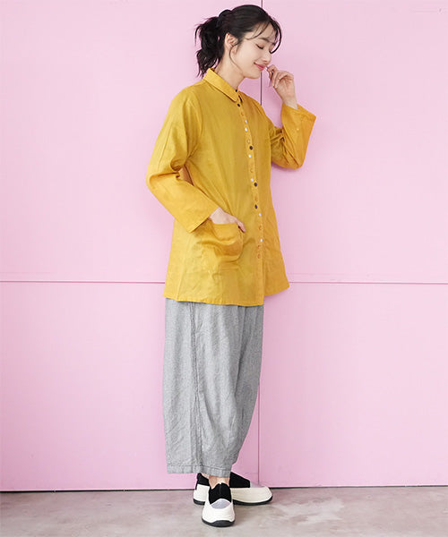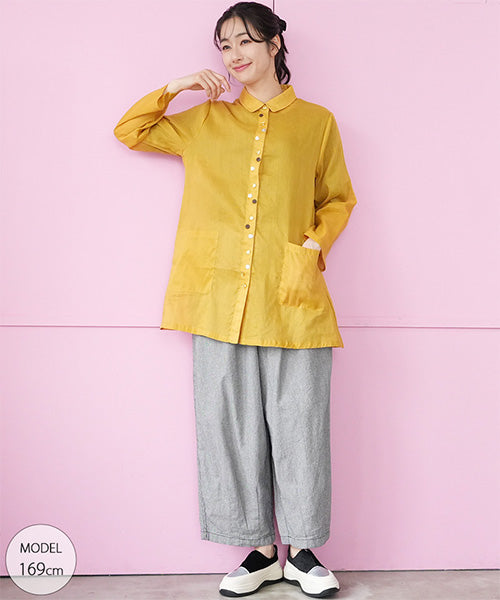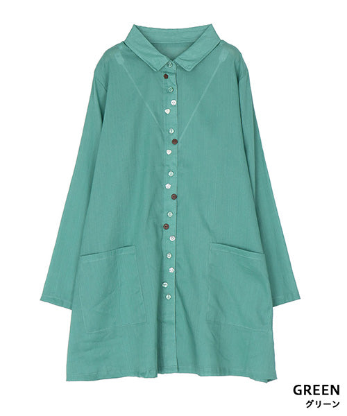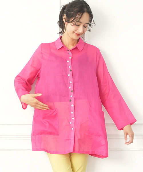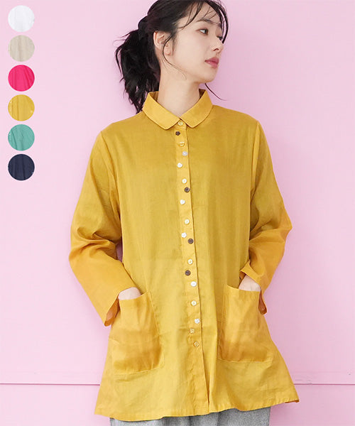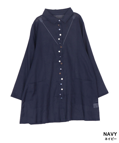 飾りボタンがたくさんついたチュニック丈のブラウスです。 ゆったり広がるAラインシルエットがボディーラインをカバーしてくれます。 透け感のある薄手生地を使用し、涼しく快適な着心地。 デイリー使いにぴったりな遊び心のあるデザインです。