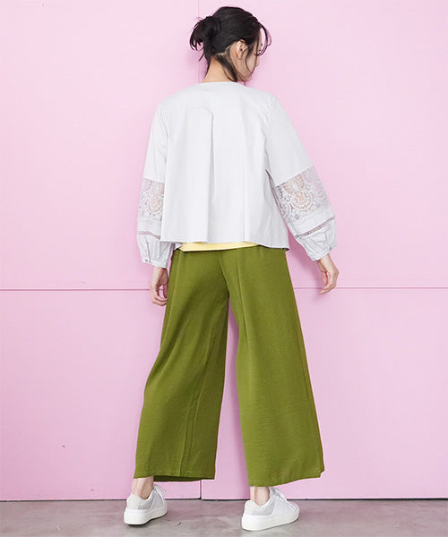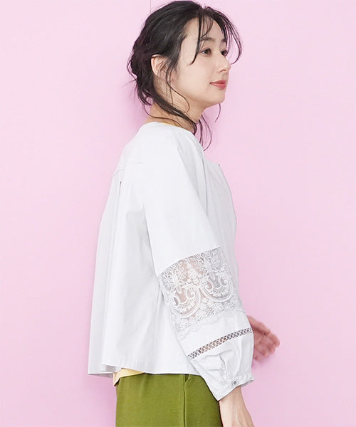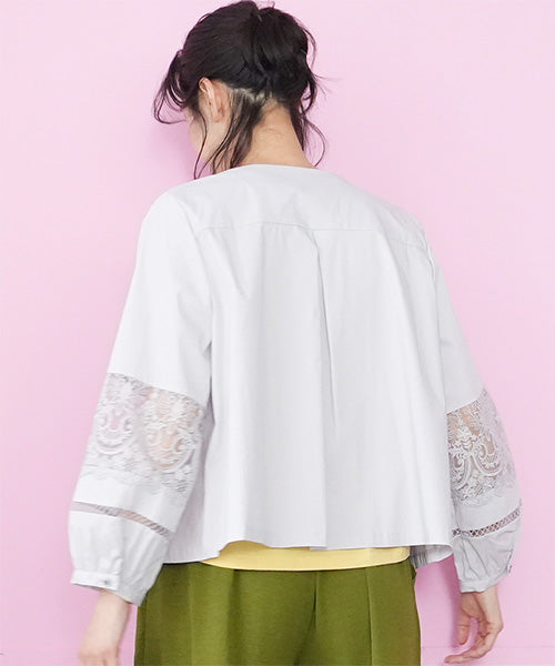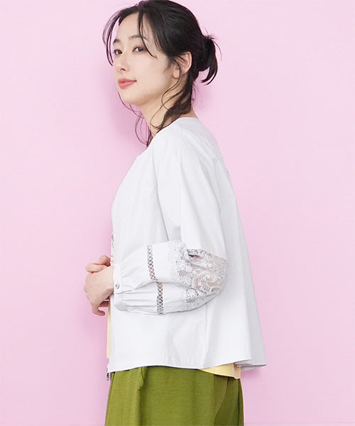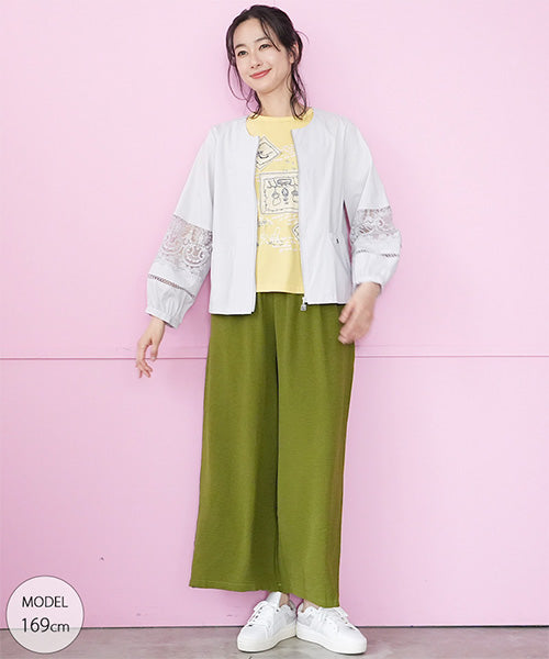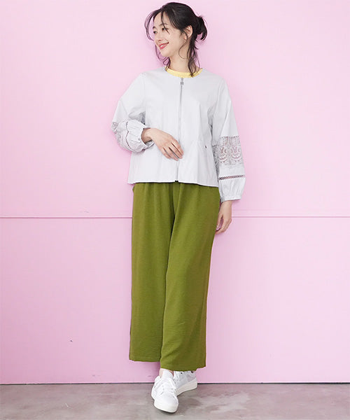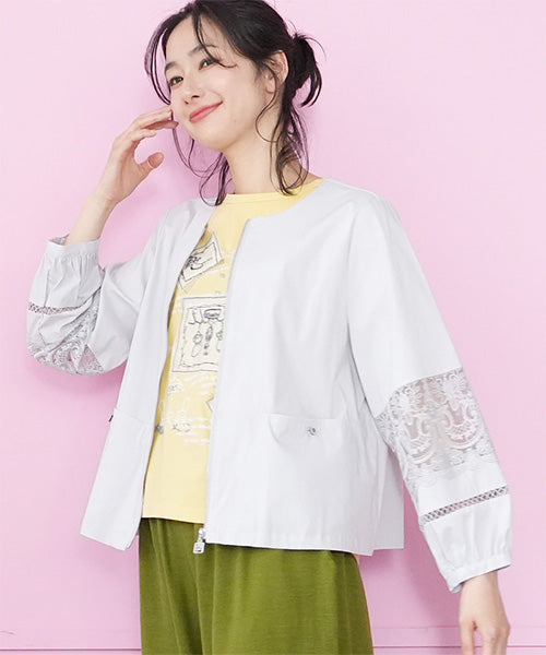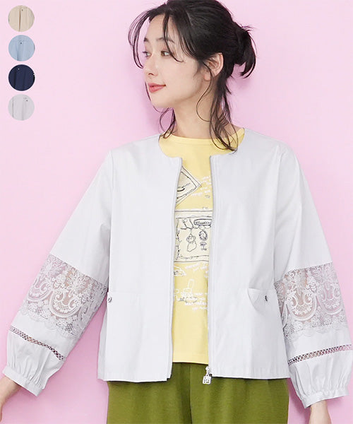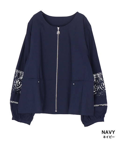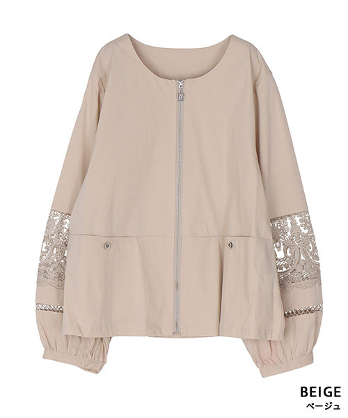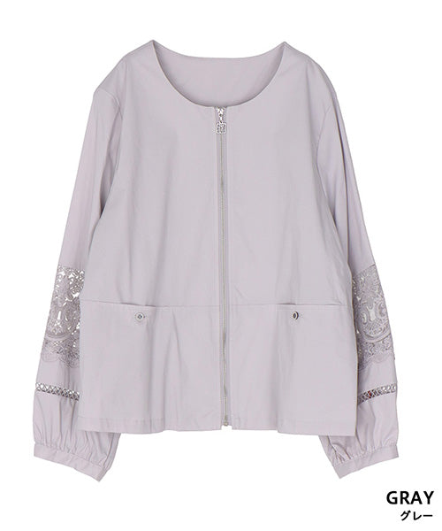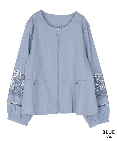 サラリとした生地に、涼やかなレース切り替えが映えるジップアップジャケットです。 刺繍の透け感が装いを軽やかな印象にしてくれます。 オーバーサイズでゆとりがあり、心地良さとキレイめが同時に楽しめます。 頑張らずともこなれて見える、季節の変わり目に重宝するアイテムです。