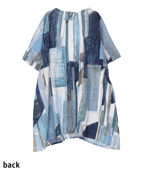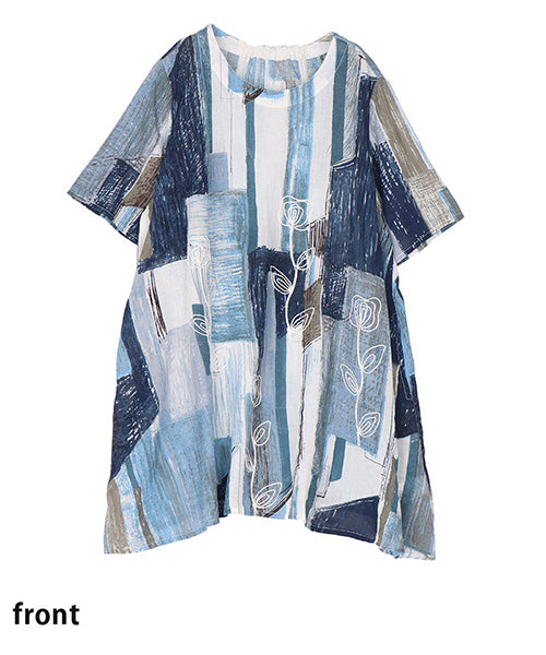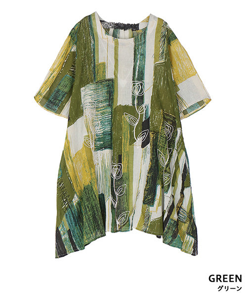 斬新なアートプリントにコード刺繍を施した、ミディアム丈のチュニックブラウスです。 無機質なプリントにコード刺繍の躍動感が相まって、モードな雰囲気を醸し出しています。 脇が長い変則的なヘムラインが、Aラインのシルエットにベストマッチです。 ストレッチが効かない分、用尺をたっぷり取り着やすさに拘りました。