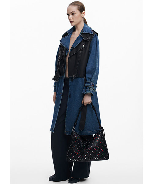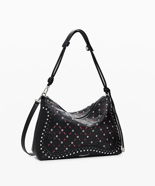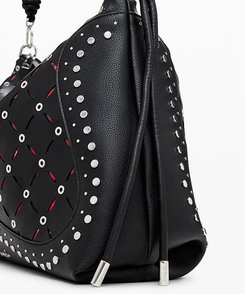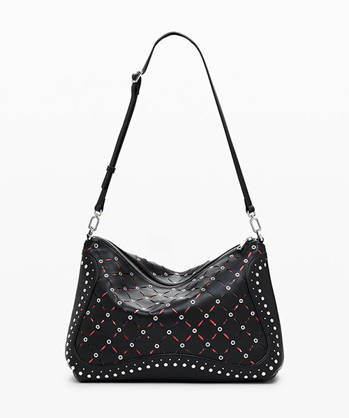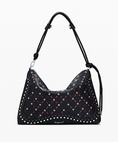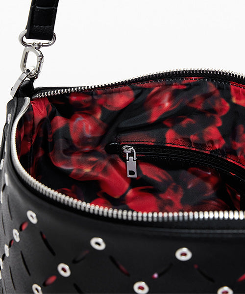 ミディアムサイズのショルダーバッグ。 レザー風生地、パンチング加工、花柄の裏地、ファスナー開閉となっています。