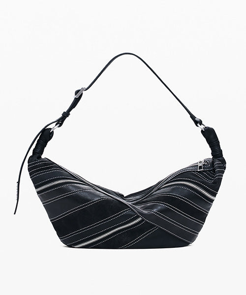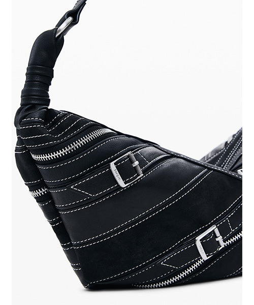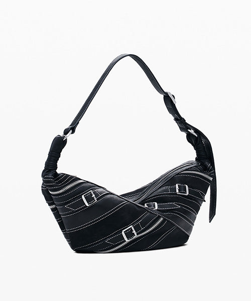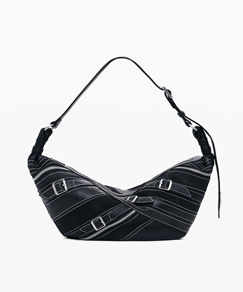 ミディアムサイズのショルダーバッグ。 レザー調の生地で作られたバナナ型、装飾的なバックルと調節可能なハンドル付き。