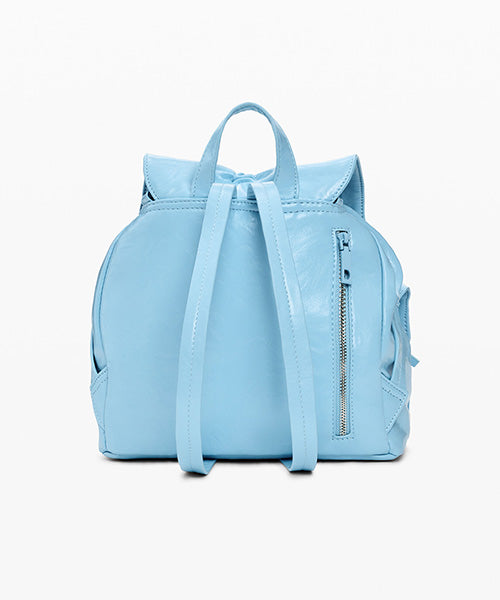 フラップ付きバックパック。 フロントポケット、取り外し可能な編み込みハンドル、装飾用リボン、取り外し可能なチャーム、光沢のあるレザー調素材で仕立てられています。