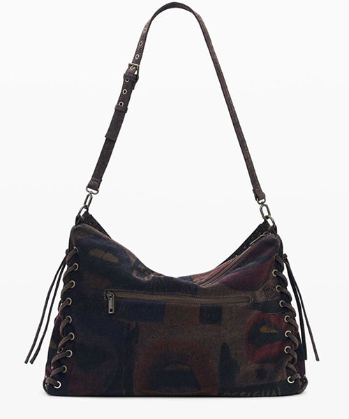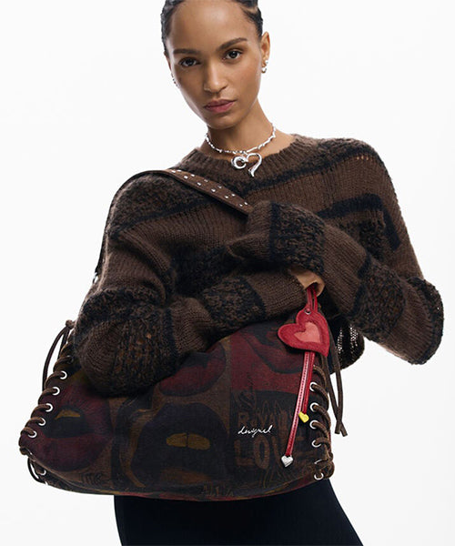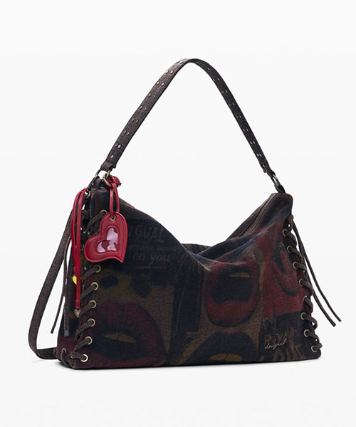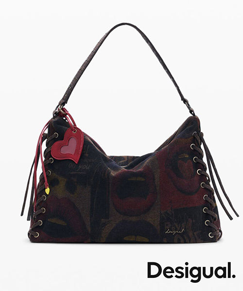 【商品説明】長方形の形をした大きなショルダーバッグで、唇のイメージが描かれたグラフィティ風プリントです。