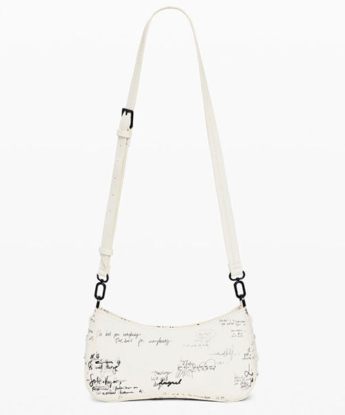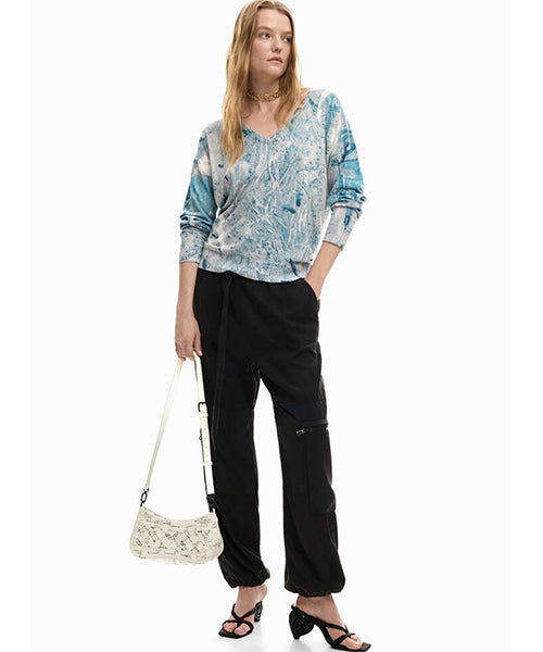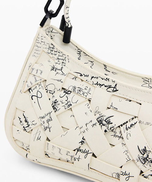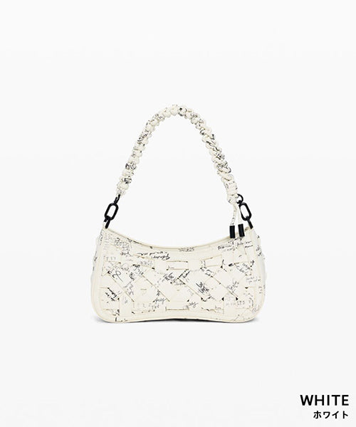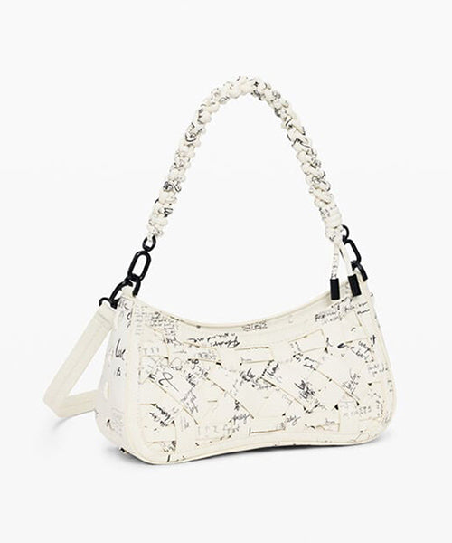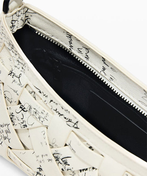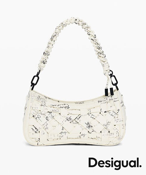 レタリングプリントでDesigualのテキストがあしらわれた、編み込みとレザー調素材の小さなバッグです。
