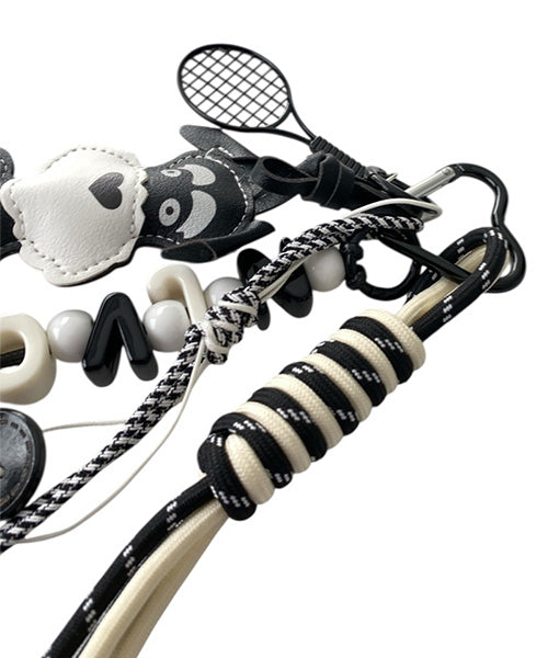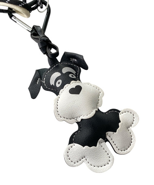 立体的なレザー調素材のワンちゃんに、ラケットやビーズなどのユニークなパーツを組み合わせて、バッグやポーチのアクセントにぴったりです。