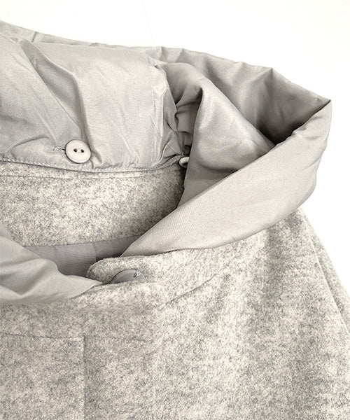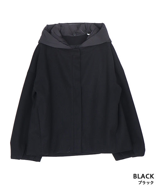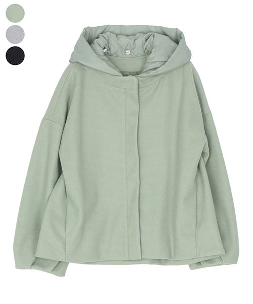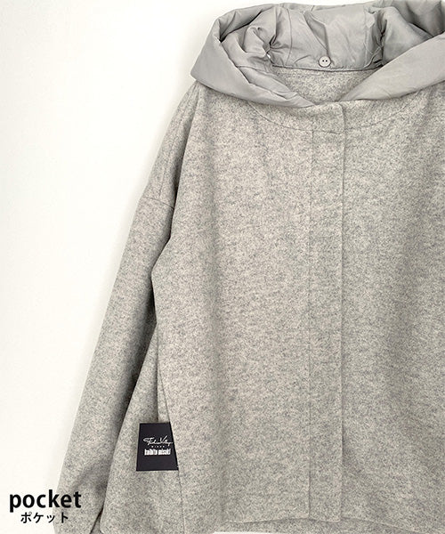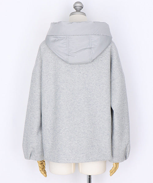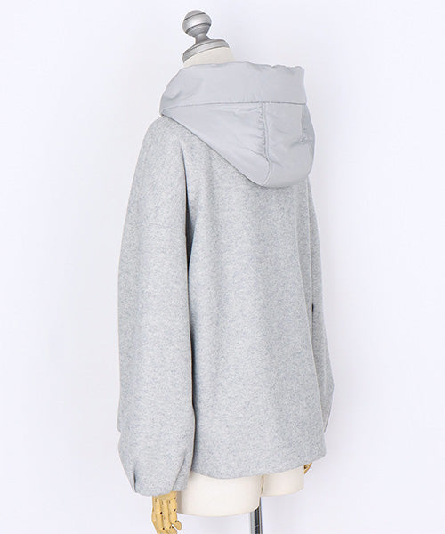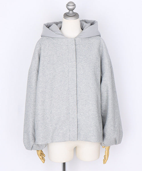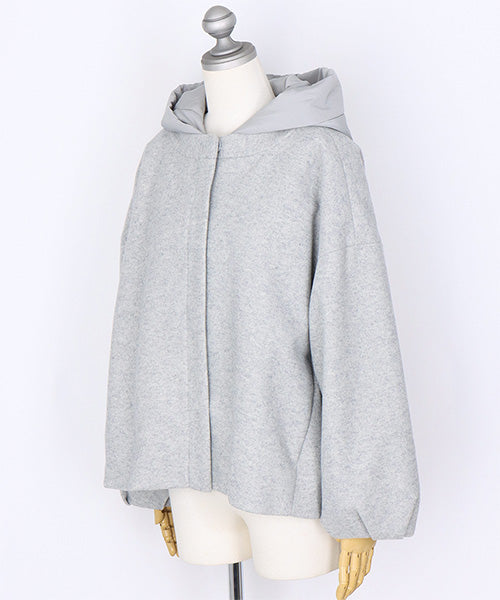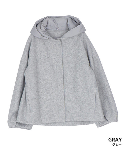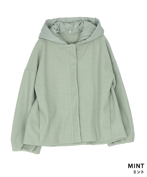ボリューム感あるフードが小顔効果もプラスし、フロントは比翼風デザインで上品な印象に仕上げています。