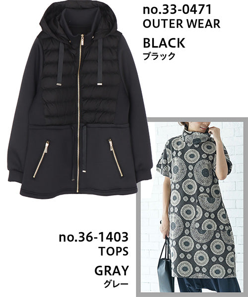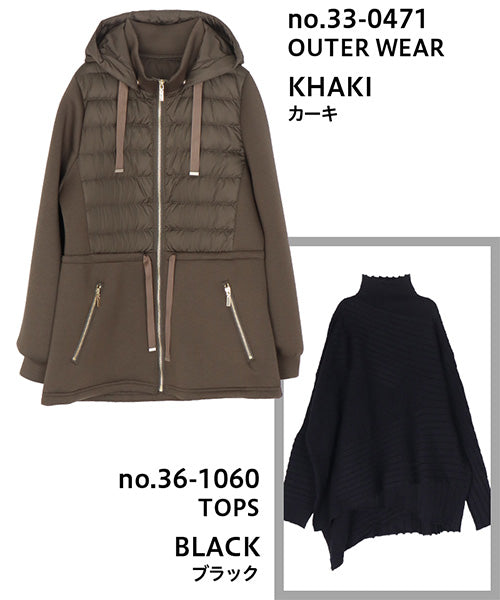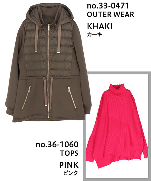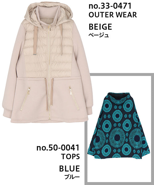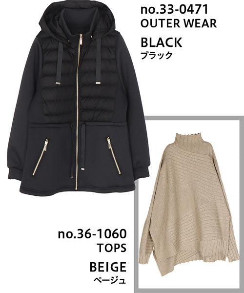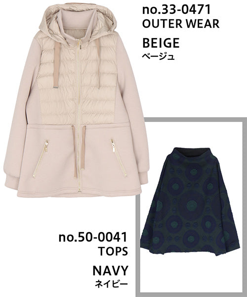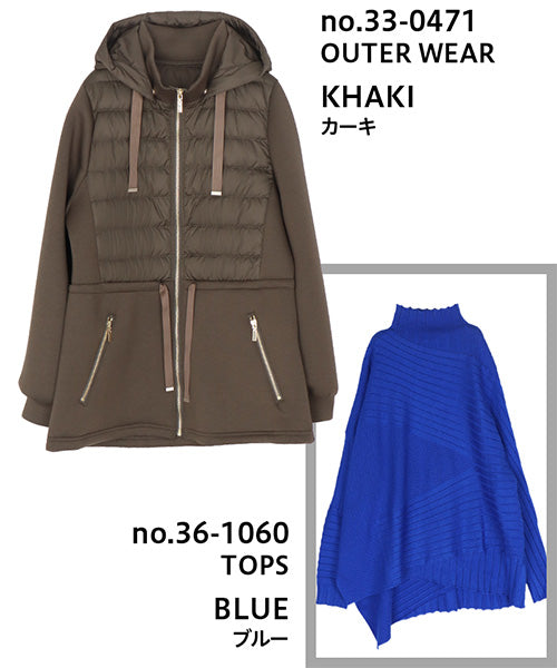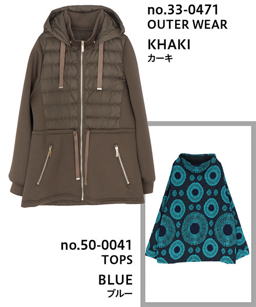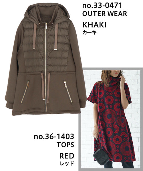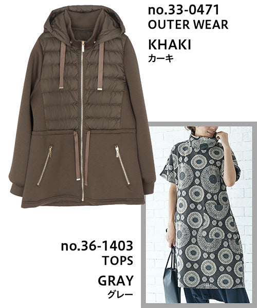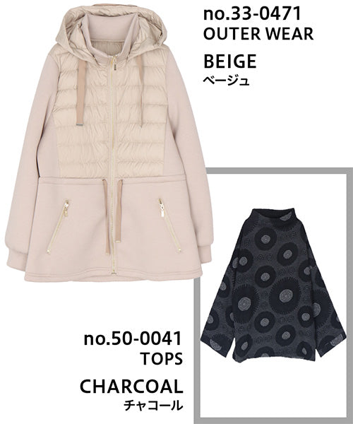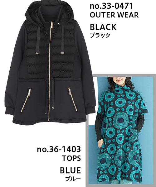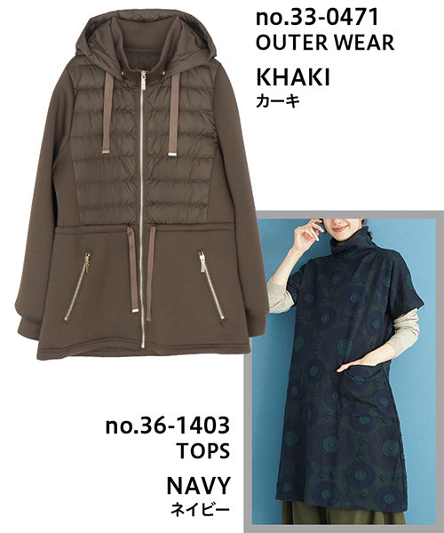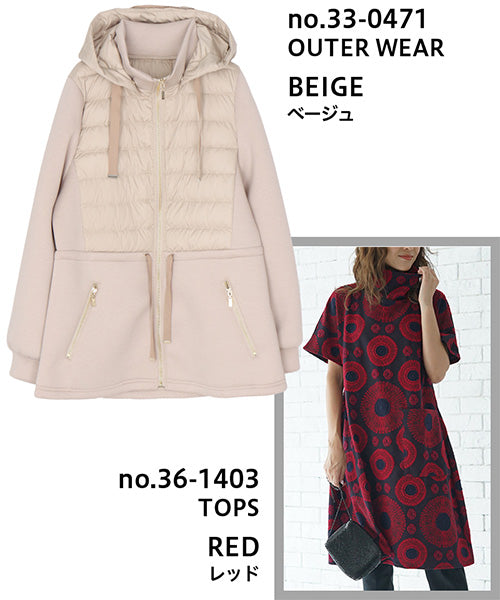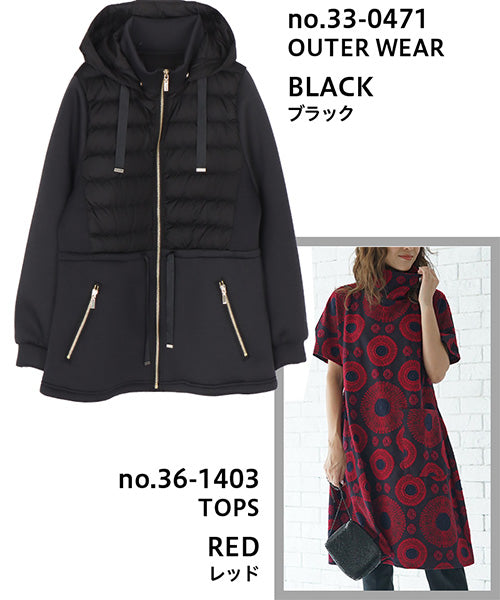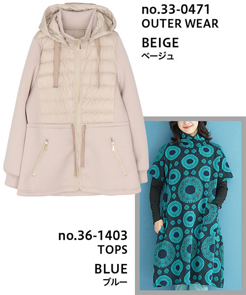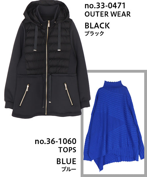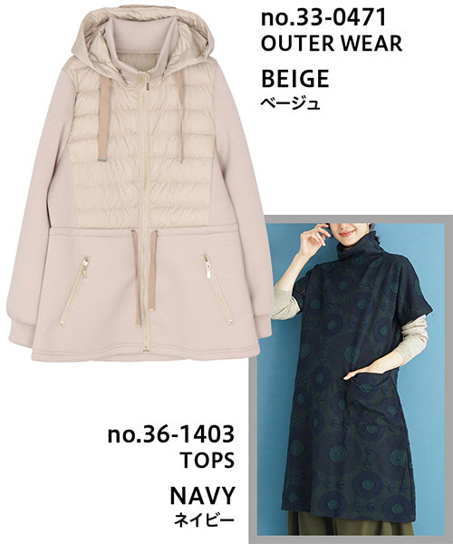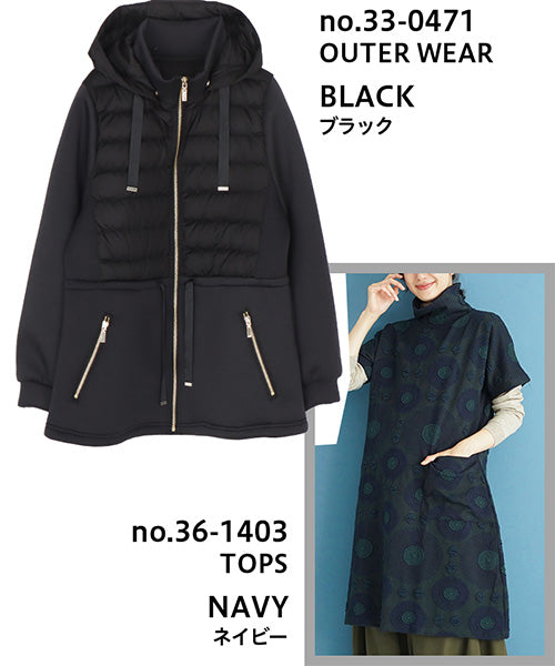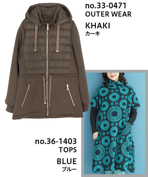 【33-0471】 本体 ポリエステル78% レーヨン16% ポリウレタン6% 別布 ポリエステル100% 詰物 ダウン80% フェザー20%