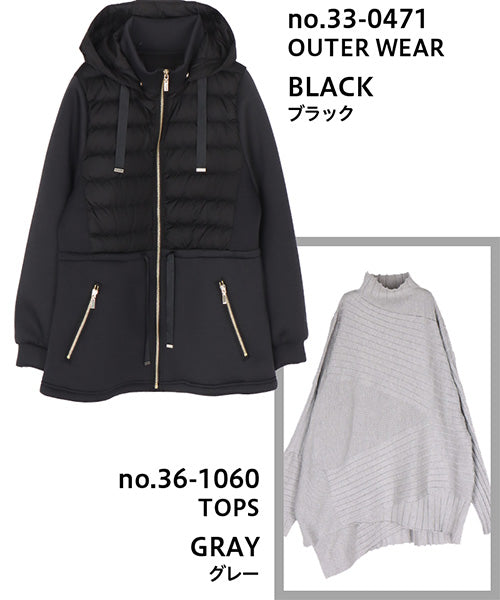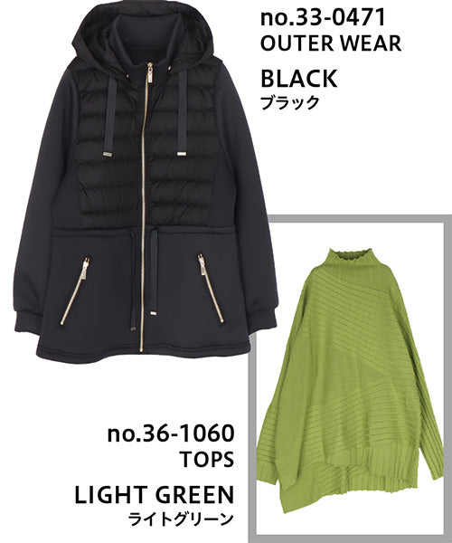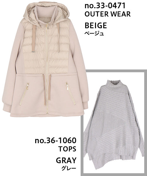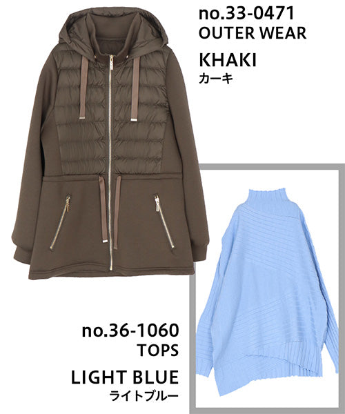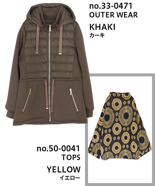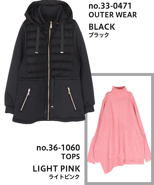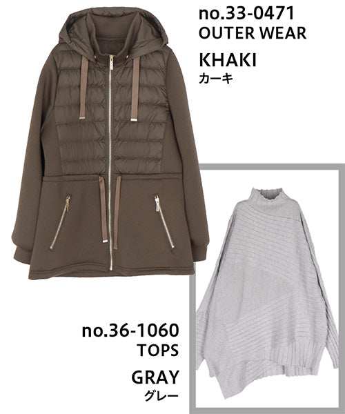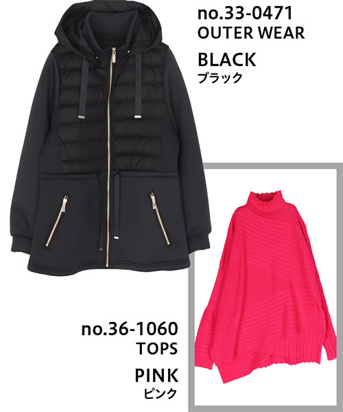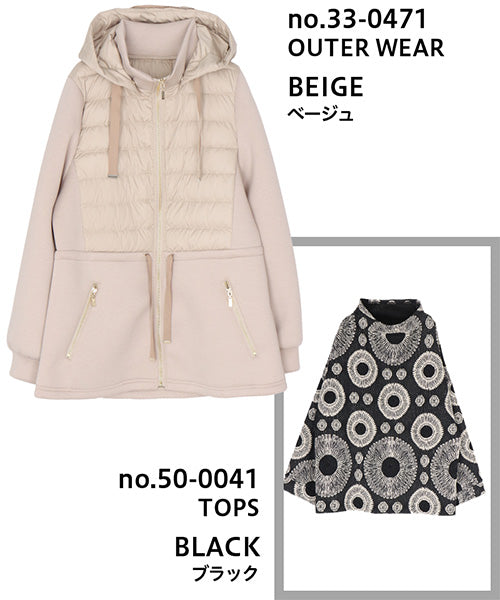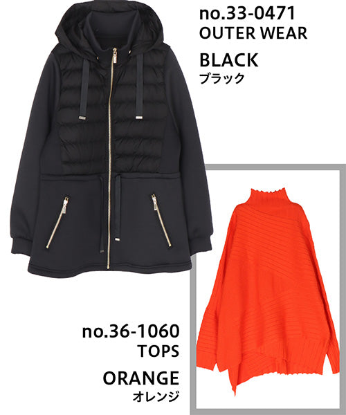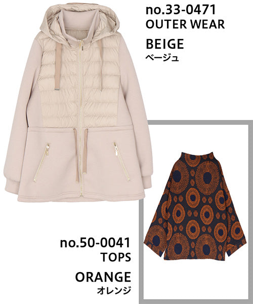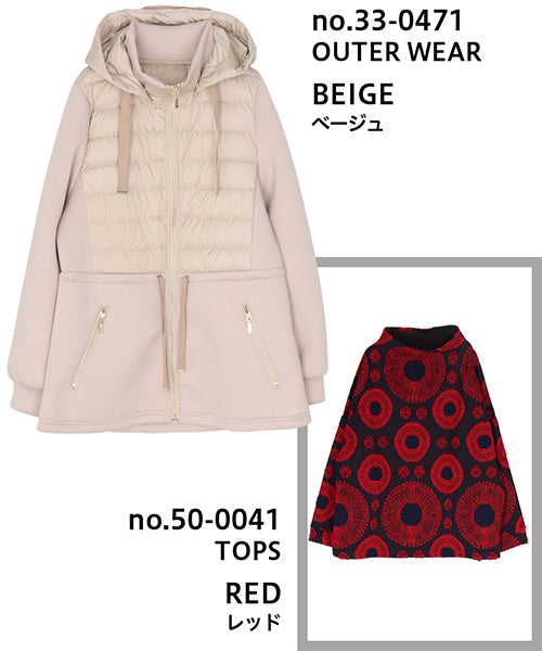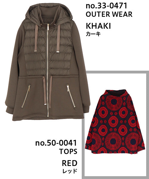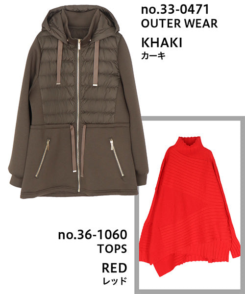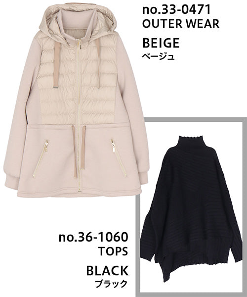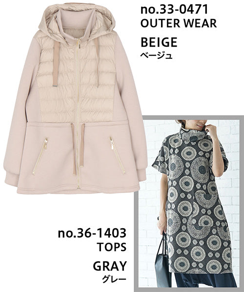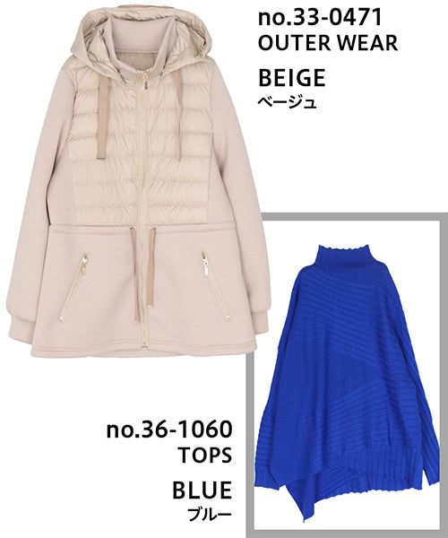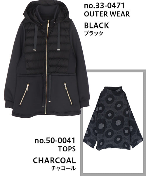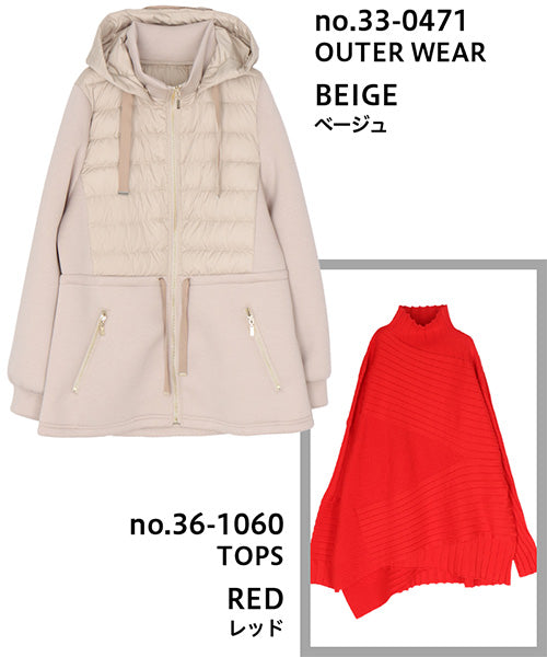 【33-0471】 本体 ポリエステル78% レーヨン16% ポリウレタン6% 別布 ポリエステル100% 詰物 ダウン80% フェザー20%