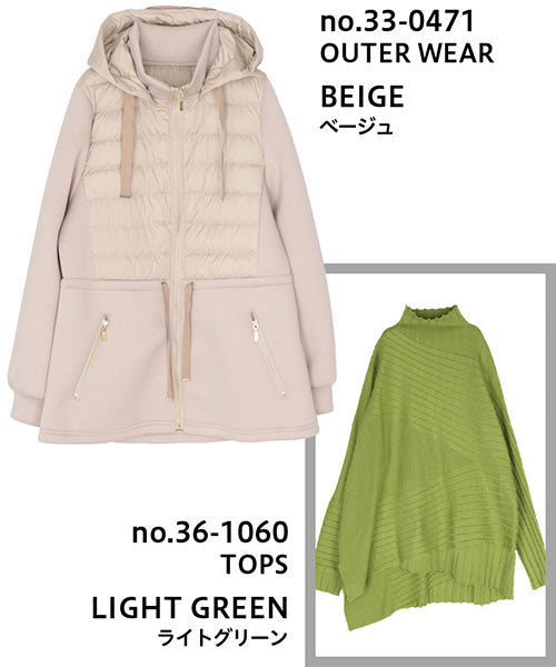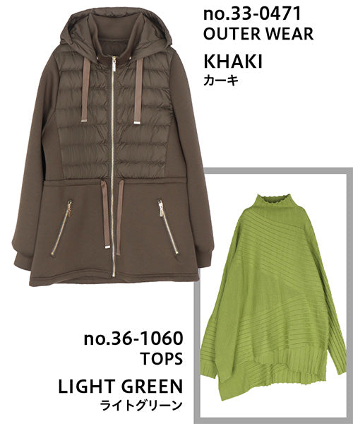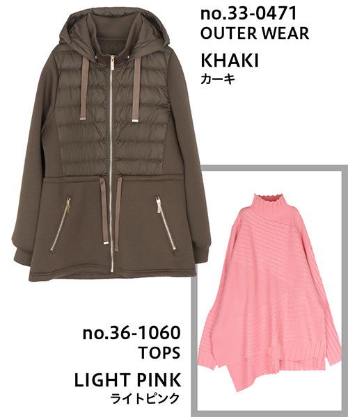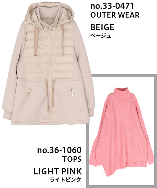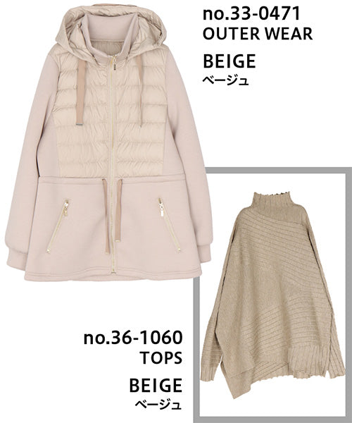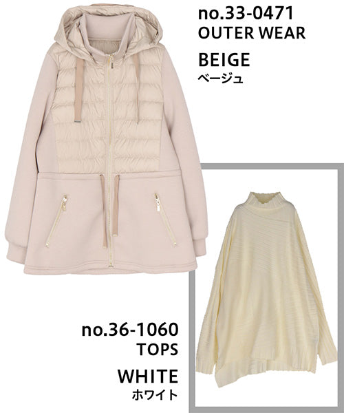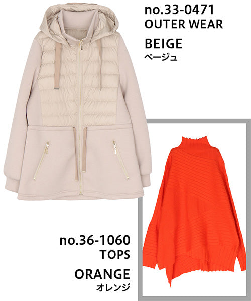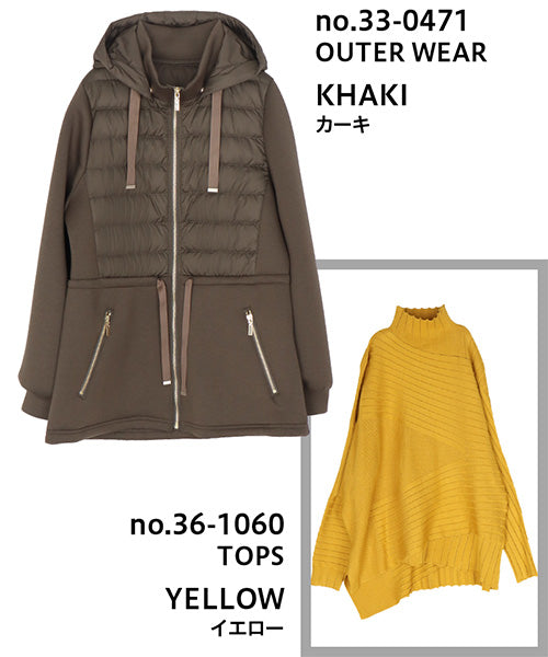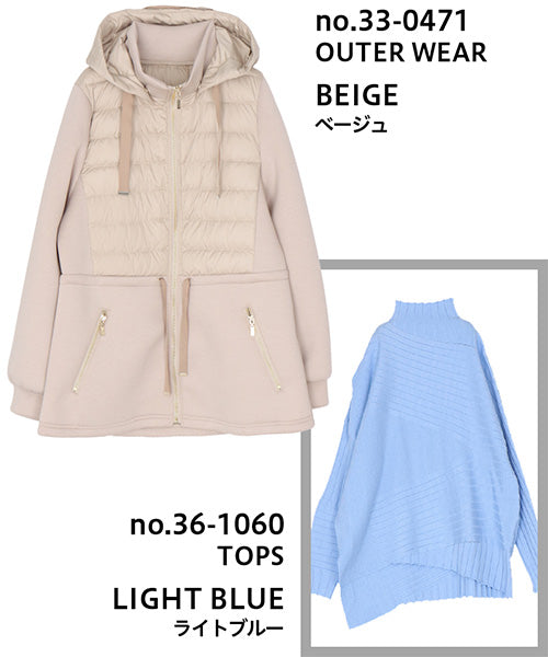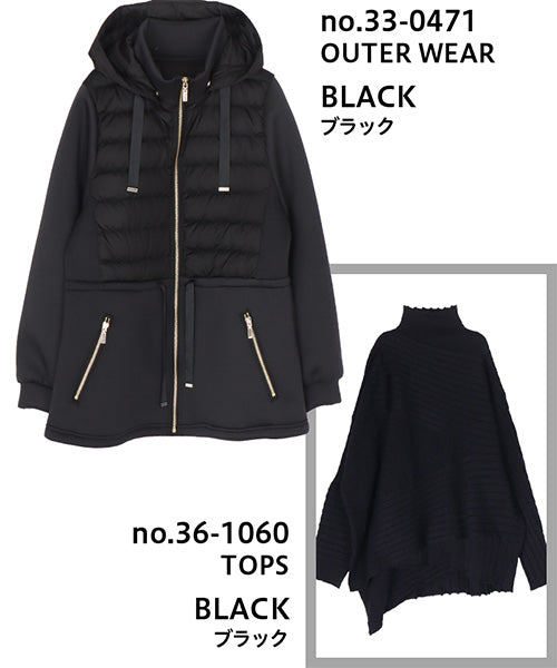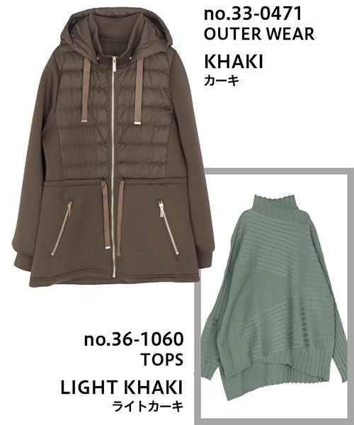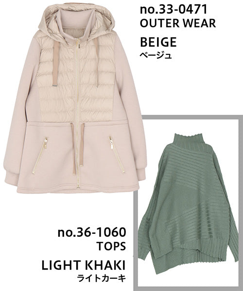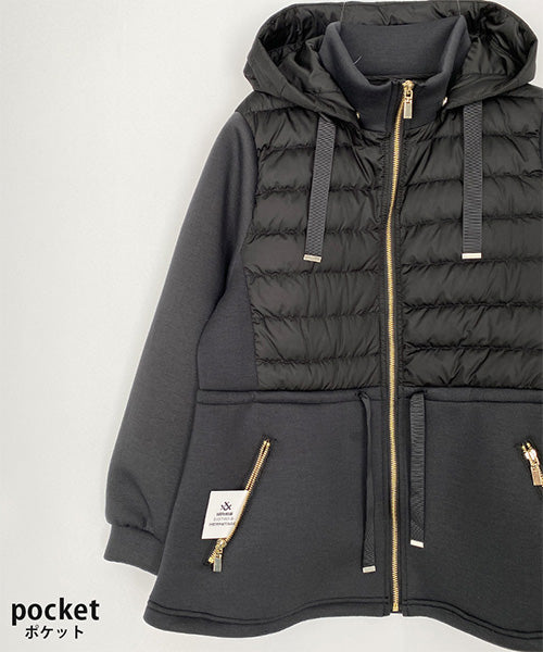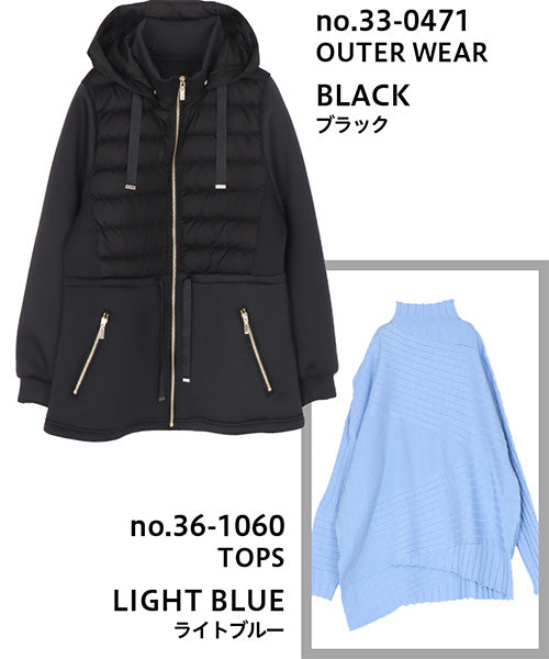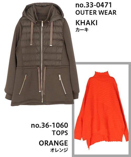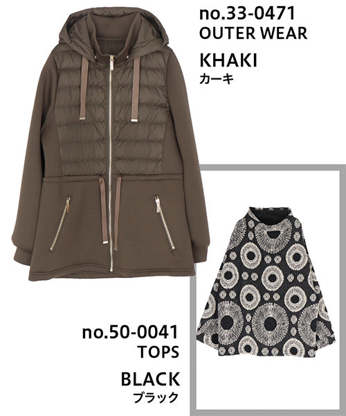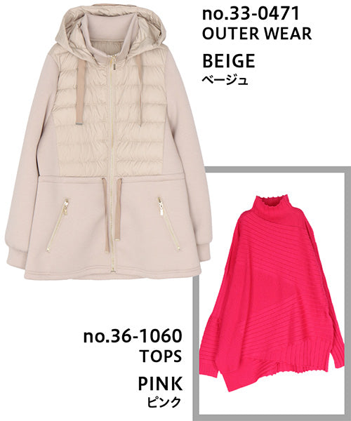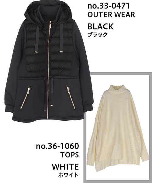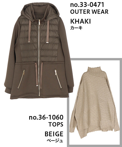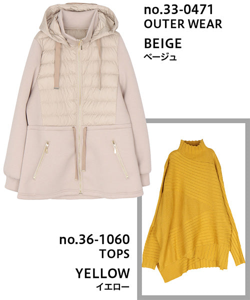 【33-0471】 本体 ポリエステル78% レーヨン16% ポリウレタン6% 別布 ポリエステル100% 詰物 ダウン80% フェザー20%