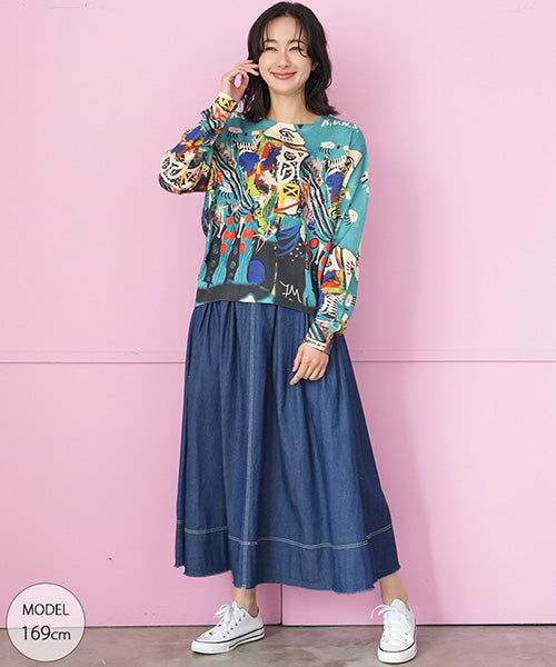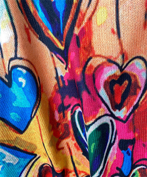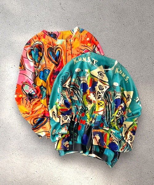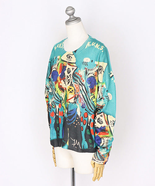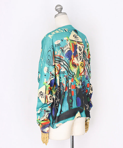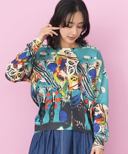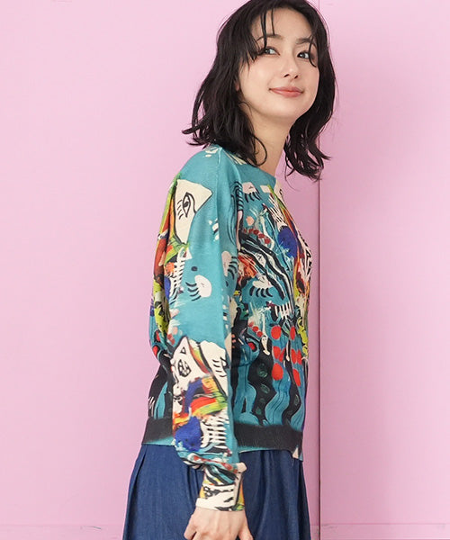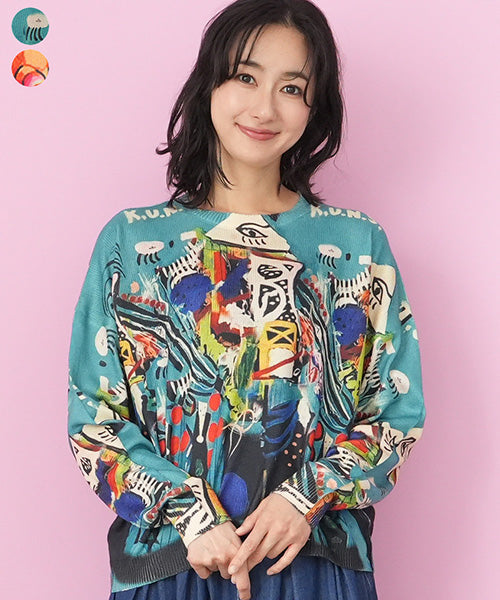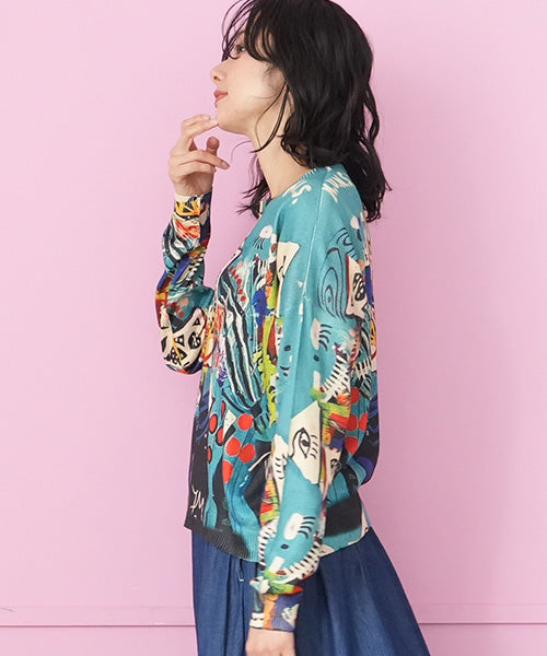 大胆なカラフルプリント柄が印象的な薄手のニット。 コンパクトに見えますが伸びもよくサラッとしていて着心地も抜群。 コーデの主役になること間違いないおすすめの1枚です。