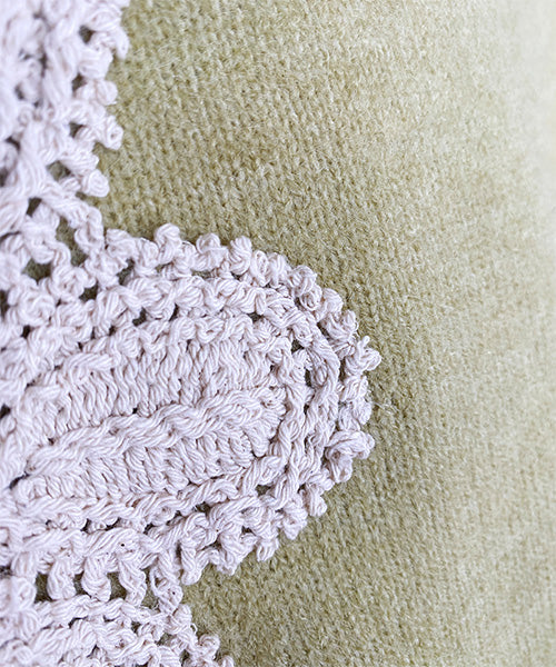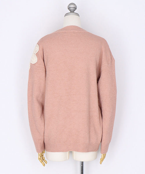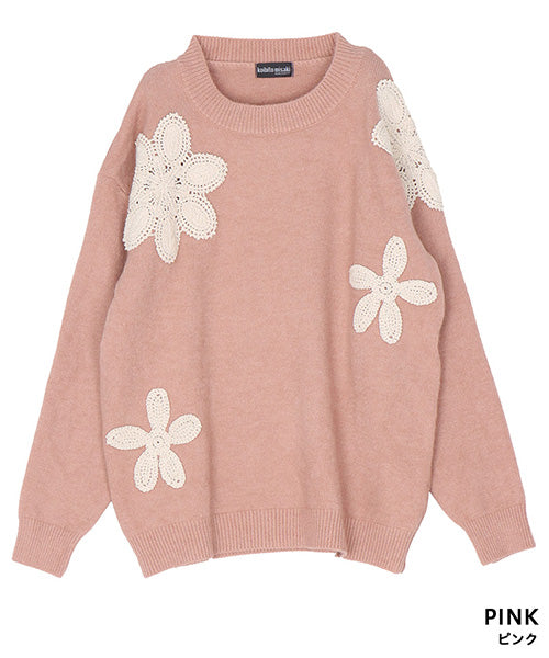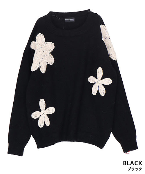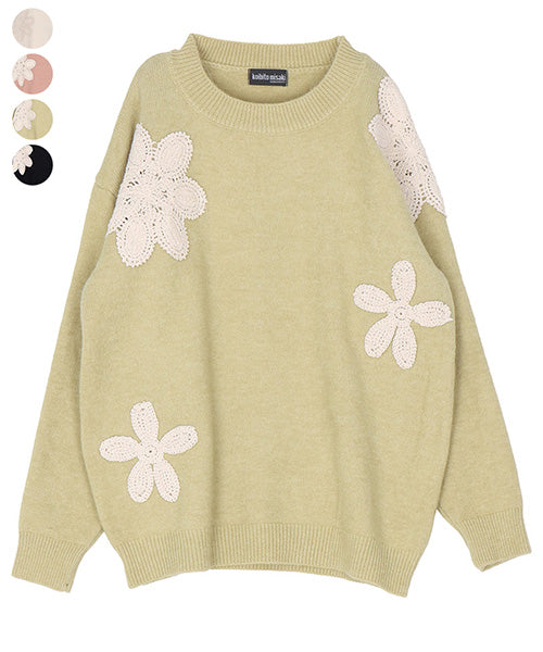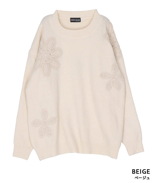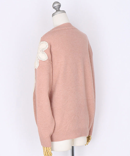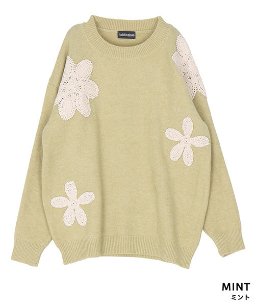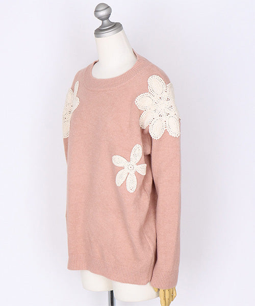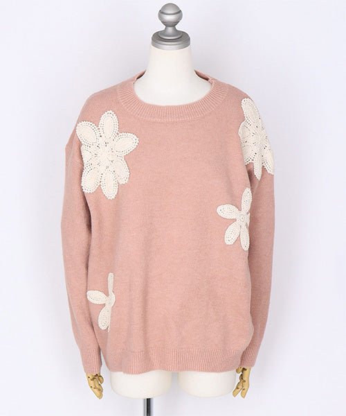 存在感のある大きめフラワーレースアップリケを散りばめた、華やかでフェミニンなニットプルオーバー。