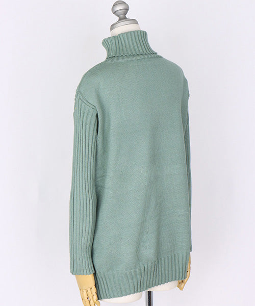 リブ編みのタートルネックが首元までしっかり包み込み、寒い季節も快適に過ごせます。