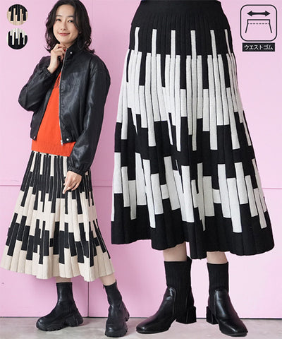 ウエストゴム幾何学柄Aラインニットスカート 06-2969