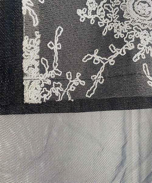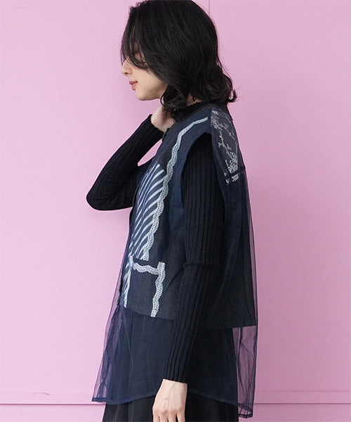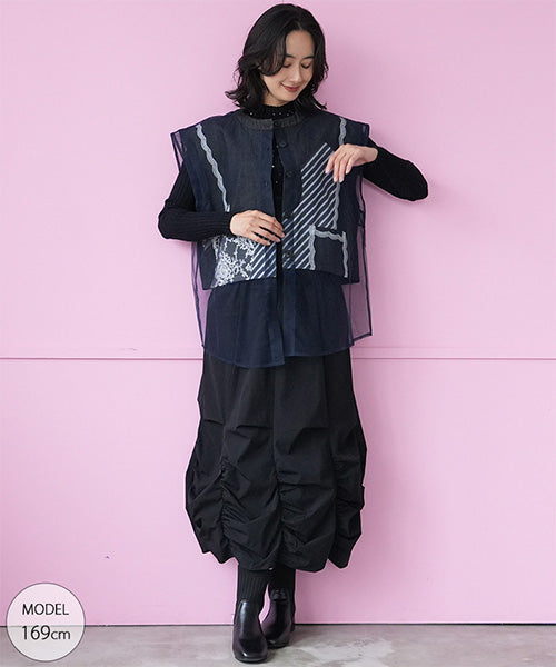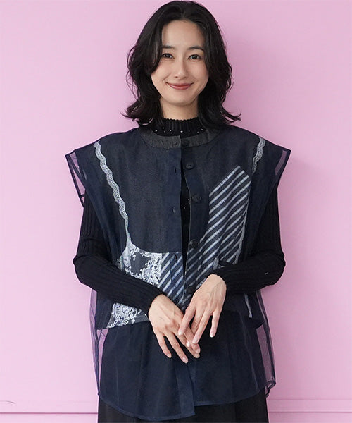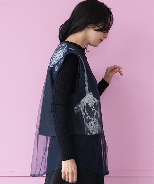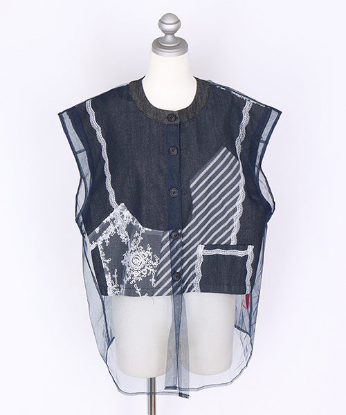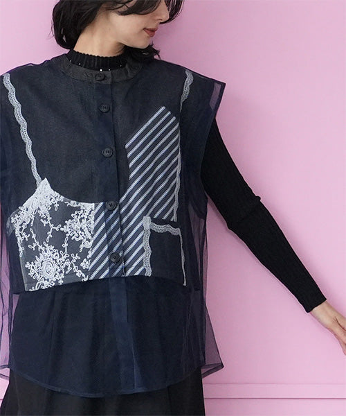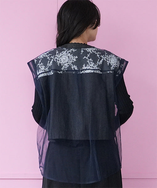 デニムにチュールを重ねたベストです。 透けて見えるレースがガーリーな印象をプラスしてくれます。 程よい厚みの素材感でロングシーズン着用できるのもポイント。 インナーやボトムを合わせてお好きなレイヤードスタイルをお楽しみください。