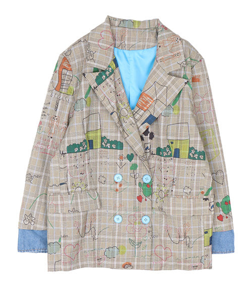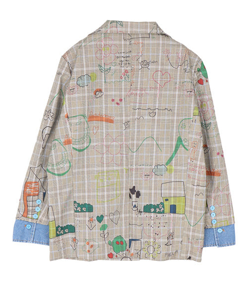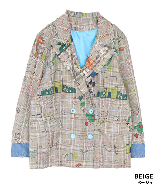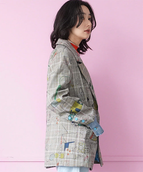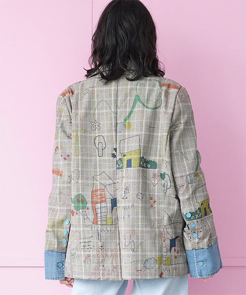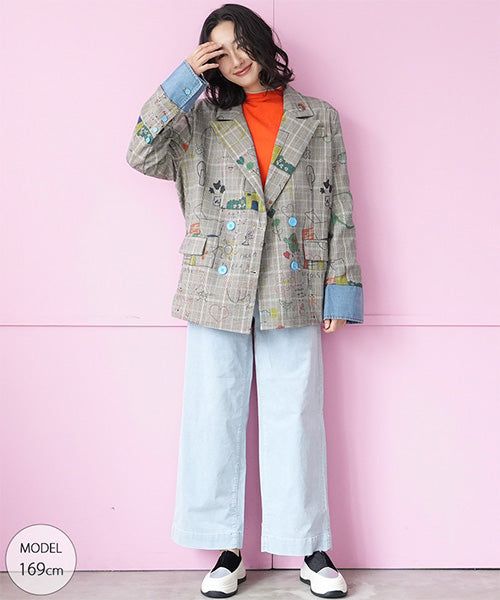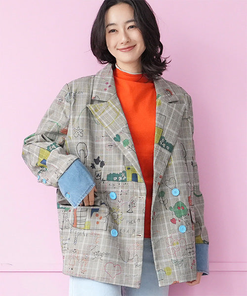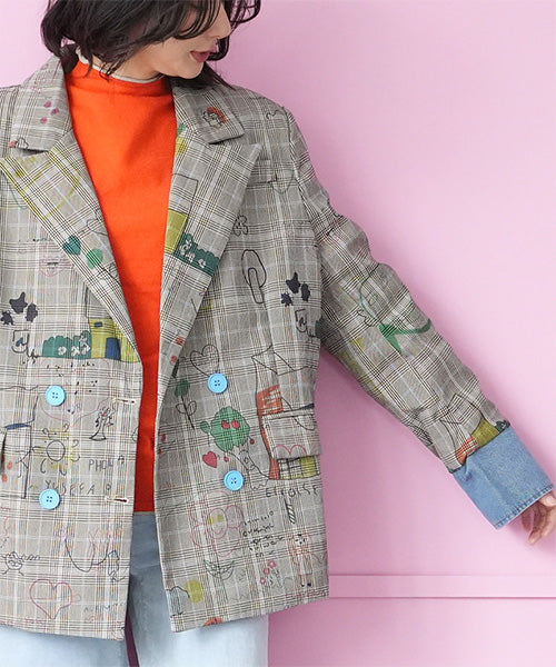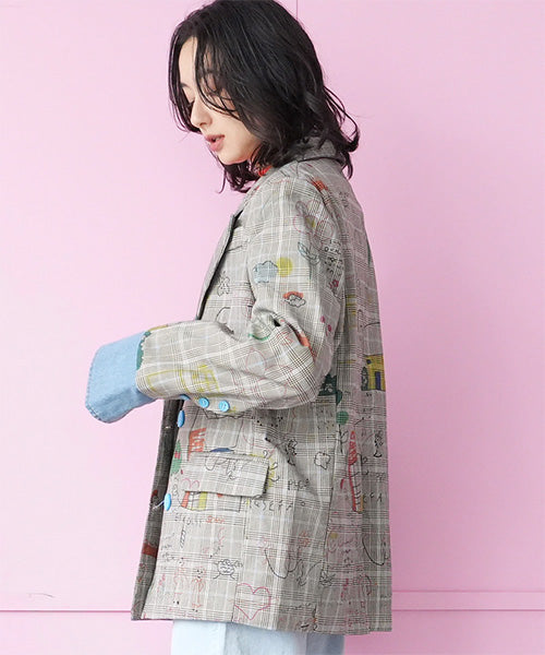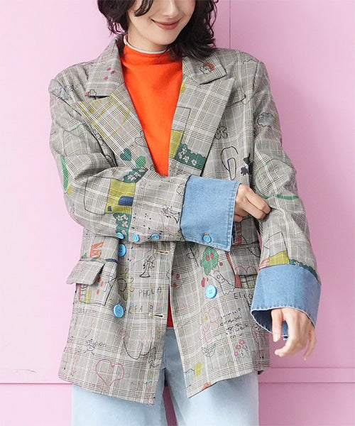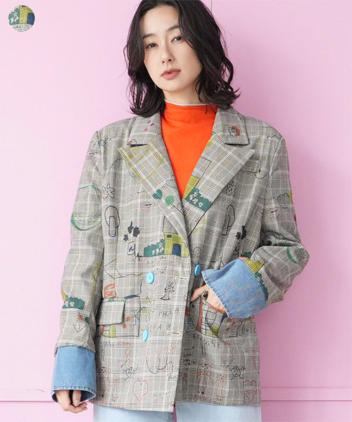 イラストプリントが可愛いグレンチェック柄のテーラードジャケット。 袖口がデニム切り替えになっているのもポイント。 ゆったりとしたオーバーサイズでラフに羽織るだけで簡単にこなれ感を演出してくれます。