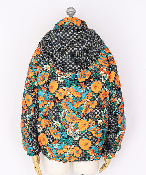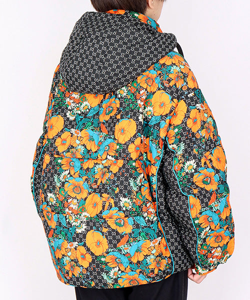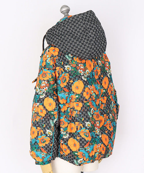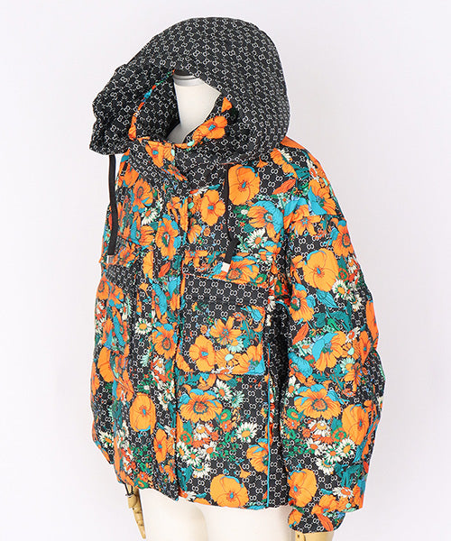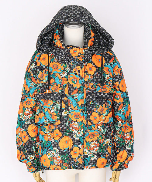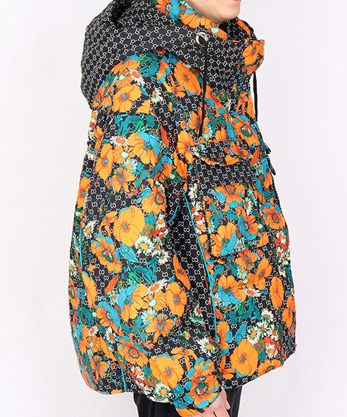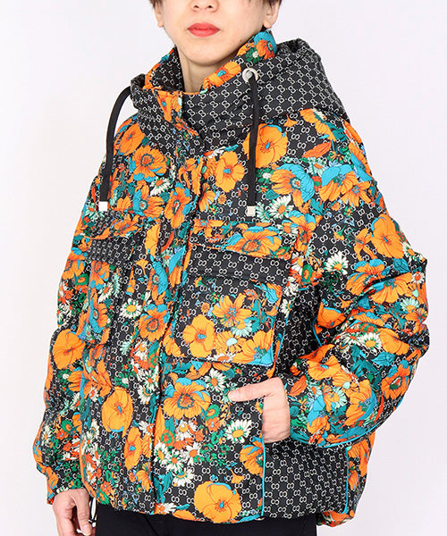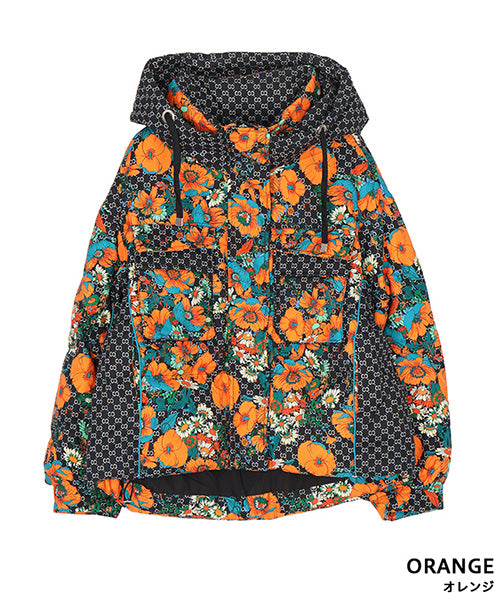 華やかなフラワープリントが目を惹く、スタイリッシュなダウンジャケット。 ベースのダークカラーに映えるオレンジとターコイズの花柄が、モードな存在感を放ちます。 さらに、フードと裾にはドローコードを採用し、シルエットを自分好みに調整可能となっています。。 フード付きのデザインでカジュアルにもエレガントにも着こなせる万能アウターです。 カジュアルにもフェミニンにもマッチする万能デザインで、デイリースタイルからお出かけコーデまで幅広く活躍します。