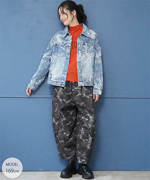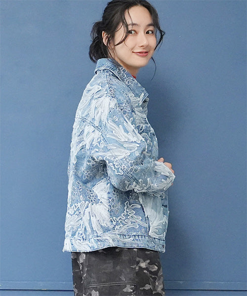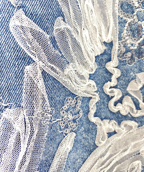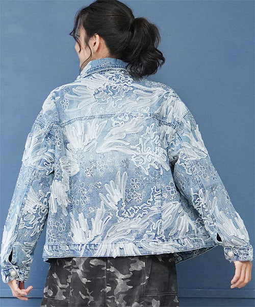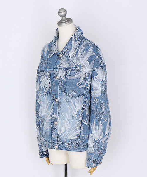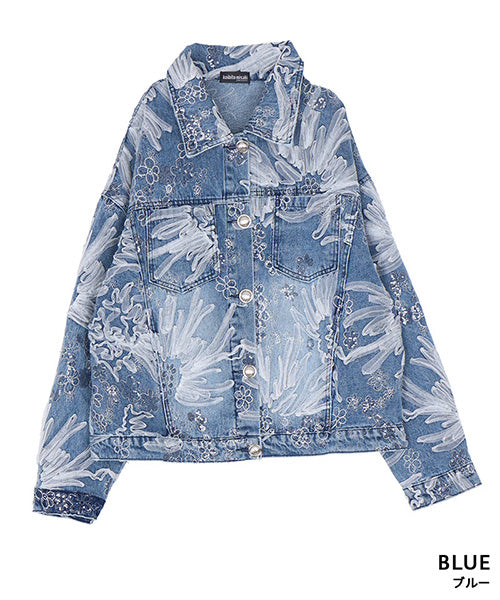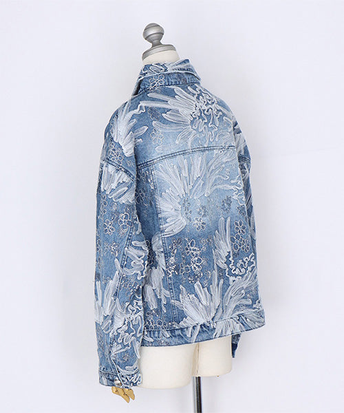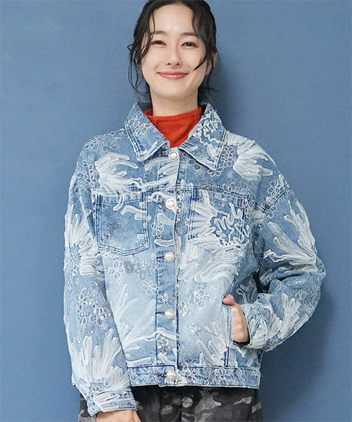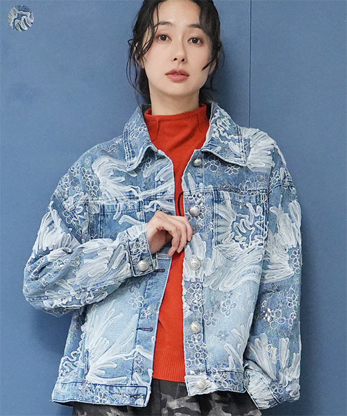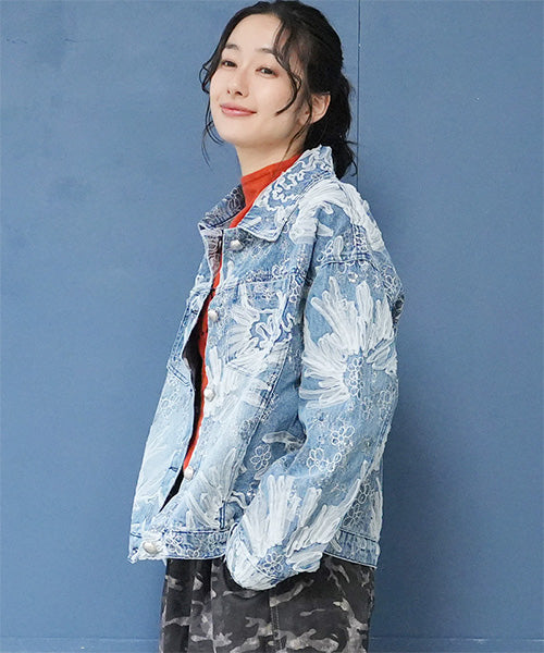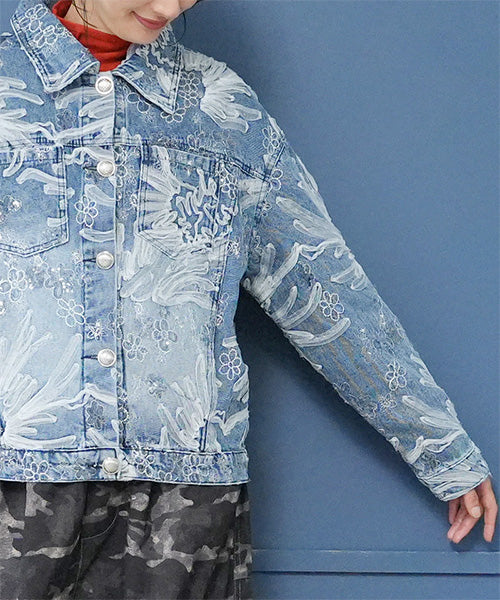 チュールやスパンコールを使ったフラワーモチーフの総刺繍が目を惹くデニムジャケット。 ハードな素材感でありながらガーリーな雰囲気をMIXした一枚です。 程よい厚みでロングシーズン着用いただけます。 コーディネートの主役になること間違いなしのおすすめアイテムです。