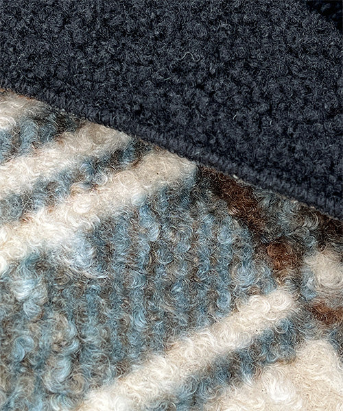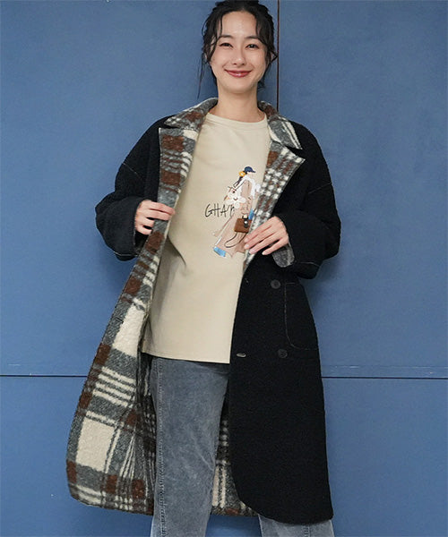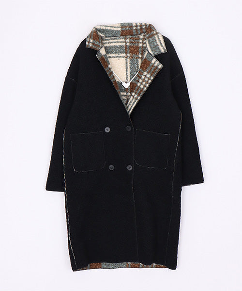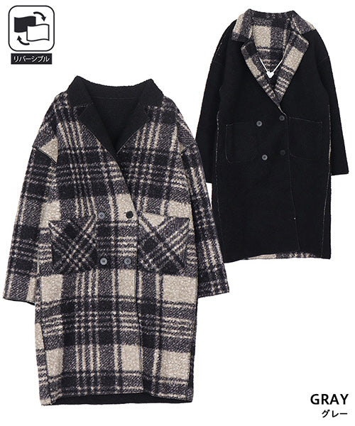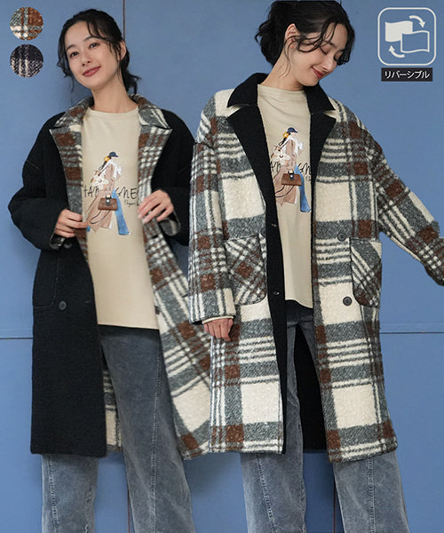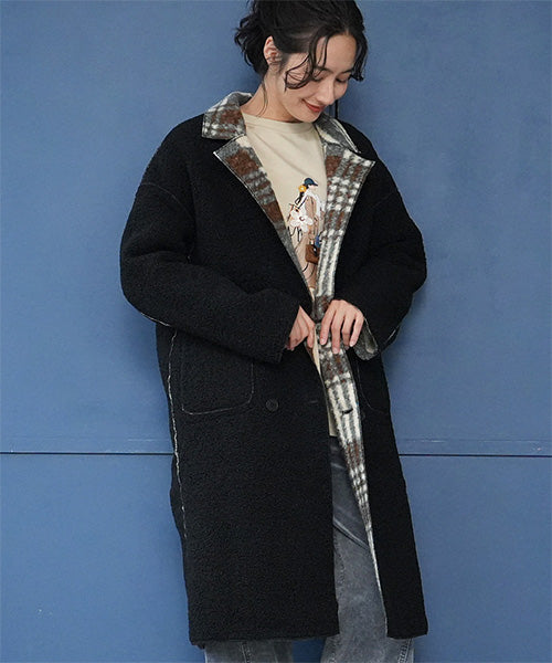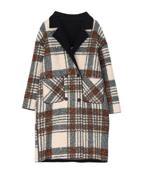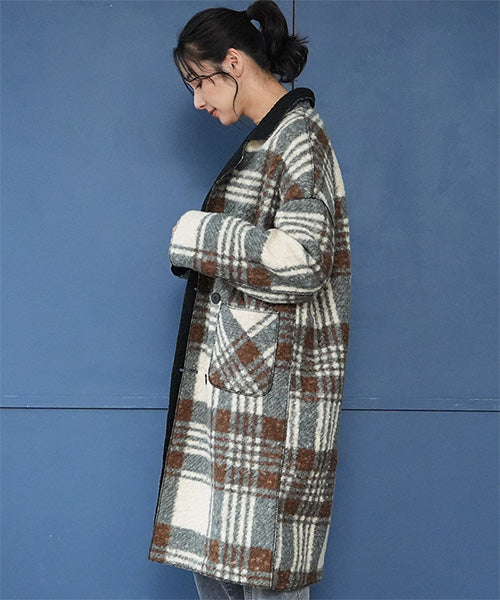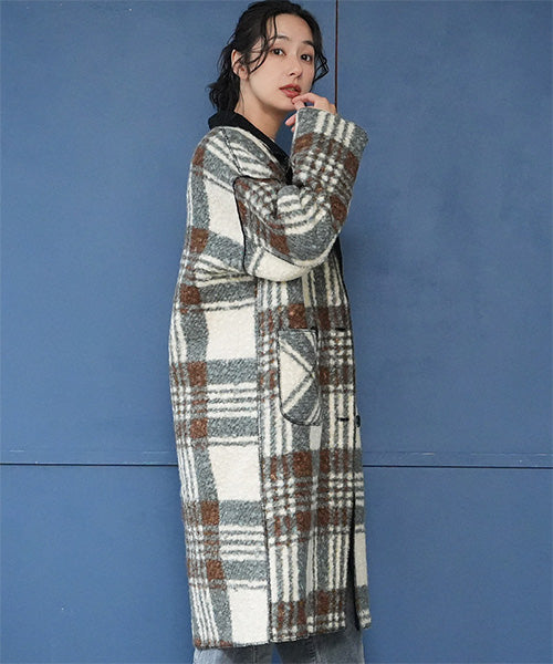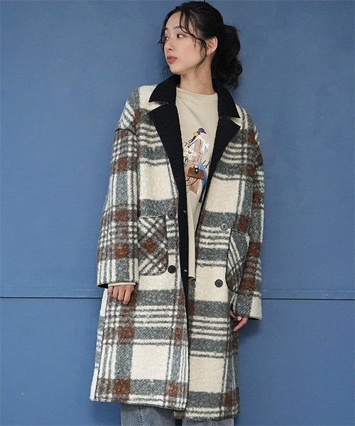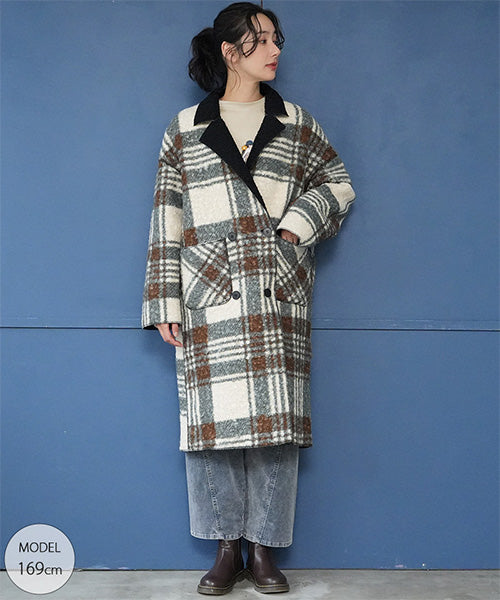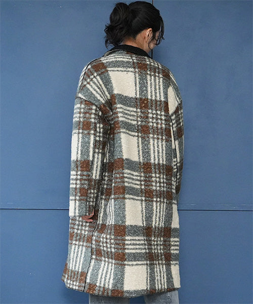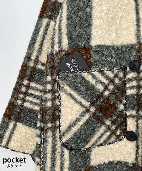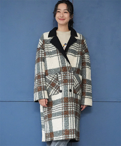 ふんわりとしたブークレ素材で仕立てた、温もり感たっぷりのチェック柄ロングコート。