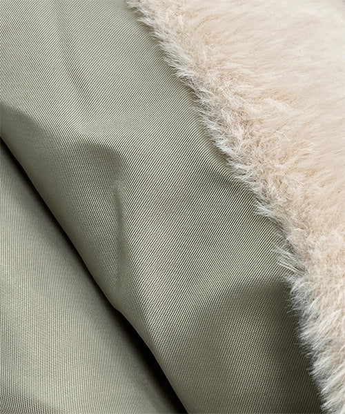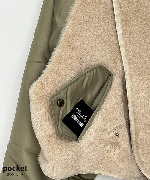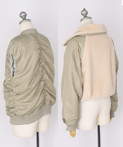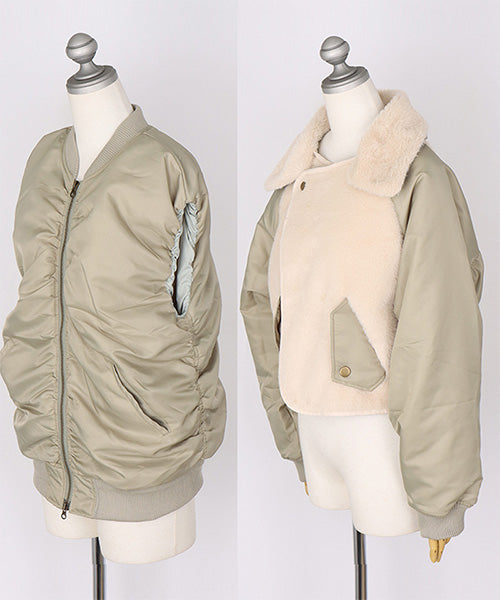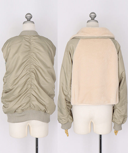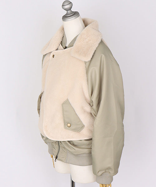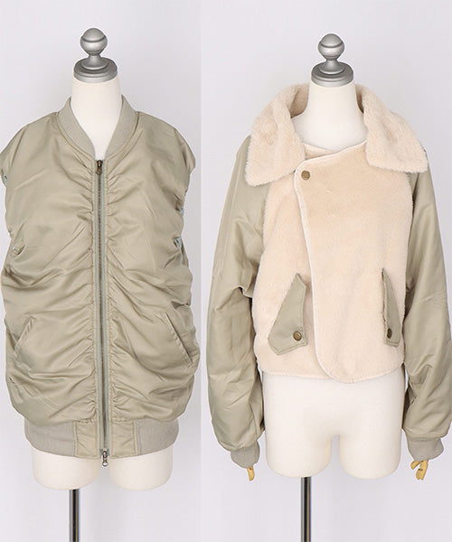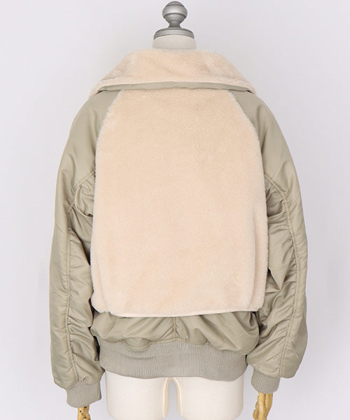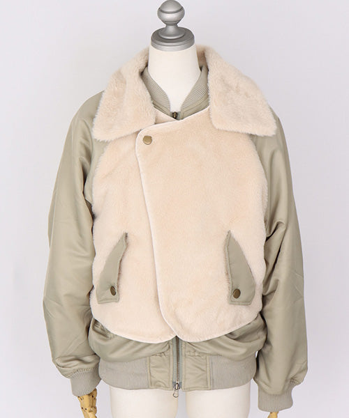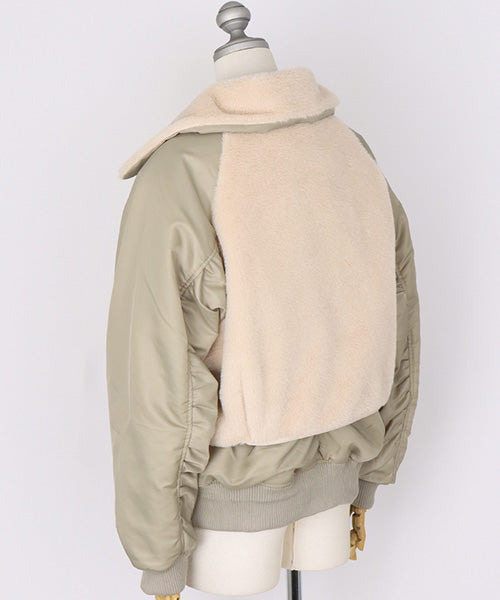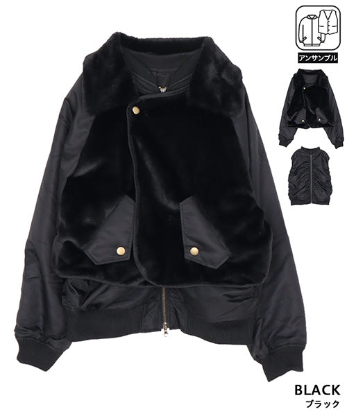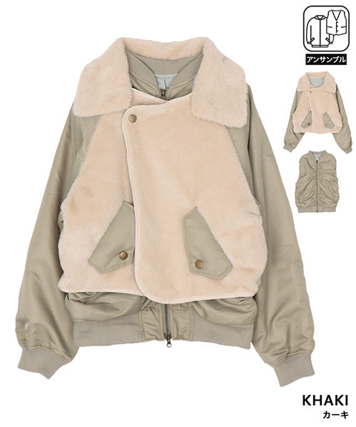 異素材の組み合わせが新鮮なベスト&ブルゾンのセットアイテム。 ベストは全体に寄せたギャザーが立体感を生み、シンプルながら表情のあるデザインに仕上げました。 ブルゾンはふんわりとしたフェイクファーが優しい印象を与えてくれます。 身頃にフェイクファーをあしらい、袖やポケット部分にはナイロン素材を組み合わせた異素材デザインがポイントです。 衿のフェイクファーは取り外し可能です。