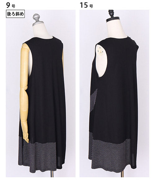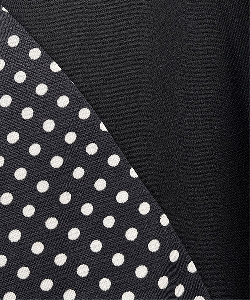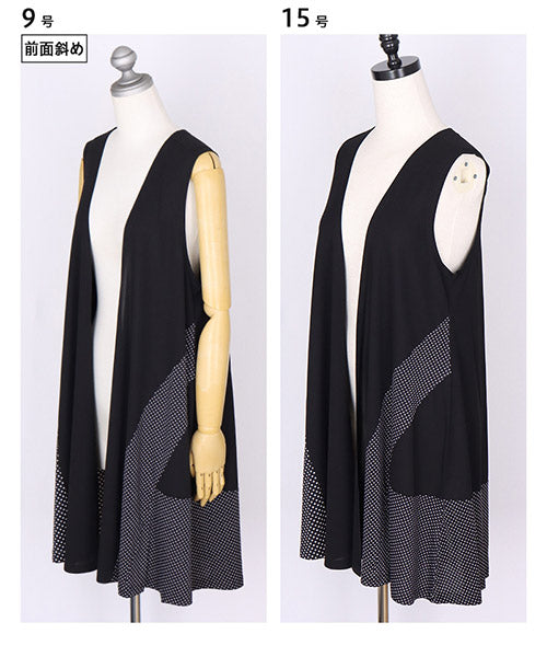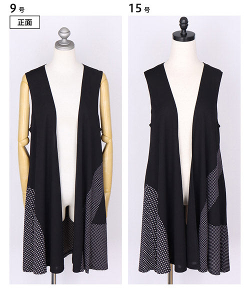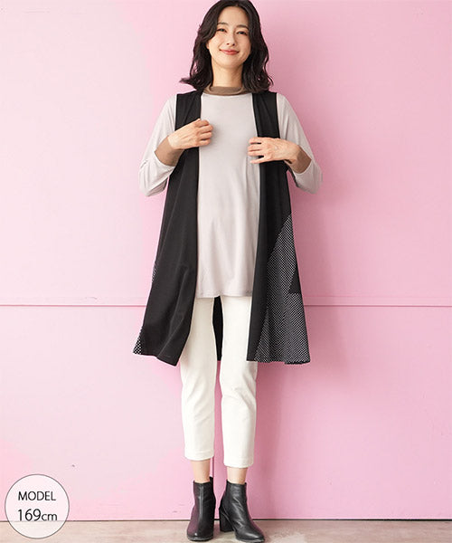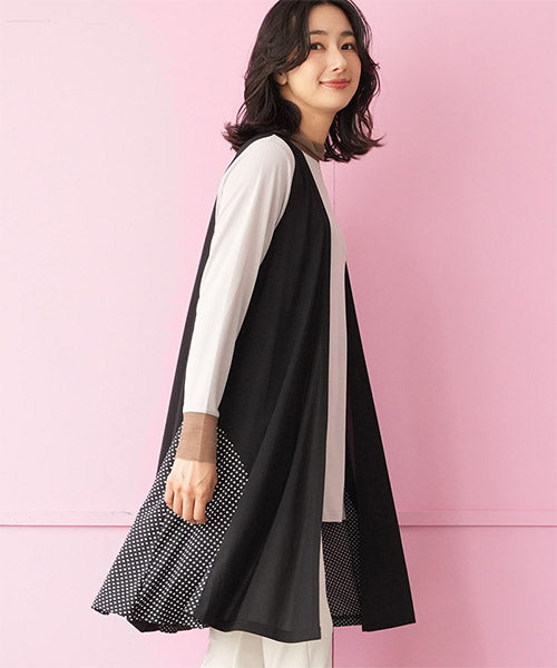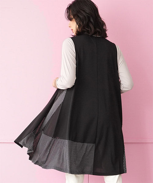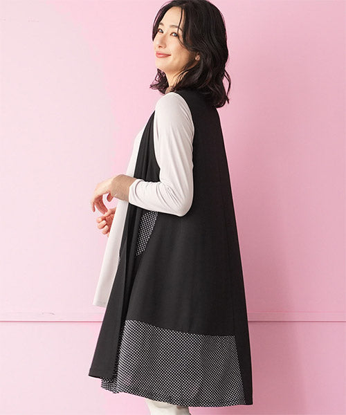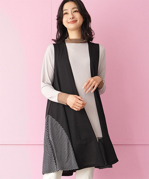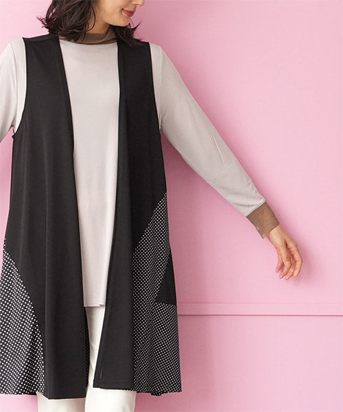シンプルなブラックをベースに、裾部分にドット柄を切り替えたノースリーブロングベスト。 ストンと落ちるシルエットが体型をすっきり見せ、動くたびに軽やかに揺れるドット切り替えが華やかさをプラスします。 前開き風のデザインで縦ラインを強調し、スタイルアップ効果も◎ ブラウスやカットソーに重ねて着るだけで、おしゃれなレイヤードスタイルが完成します。