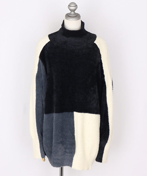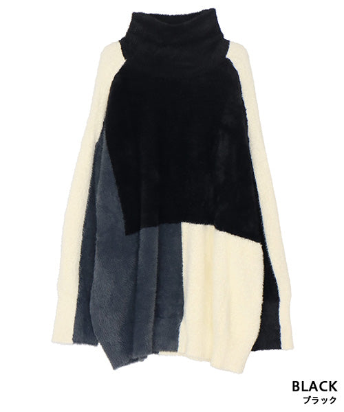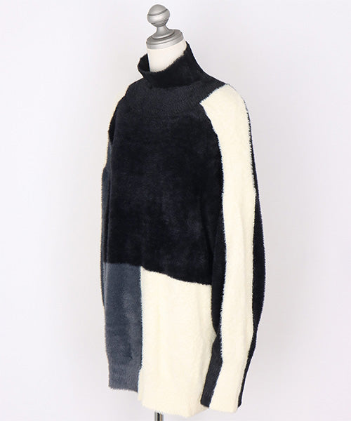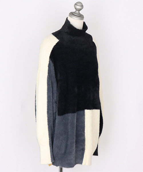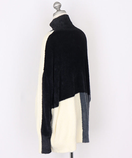 ふんわり柔らかいシャギー素材を、ニットプルオーバー。 大胆なカラーブロッキングが印象的。 異なるトーンのブラック×グレー×ホワイトを組み合わせ、モード感漂う1枚に仕上げました。 存在感のあるルックスながら、ふわりと軽くて暖かい素材感で着心地も快適。