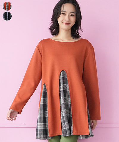 チェック柄異素材レイヤード切替フレアチュニック 36-1688